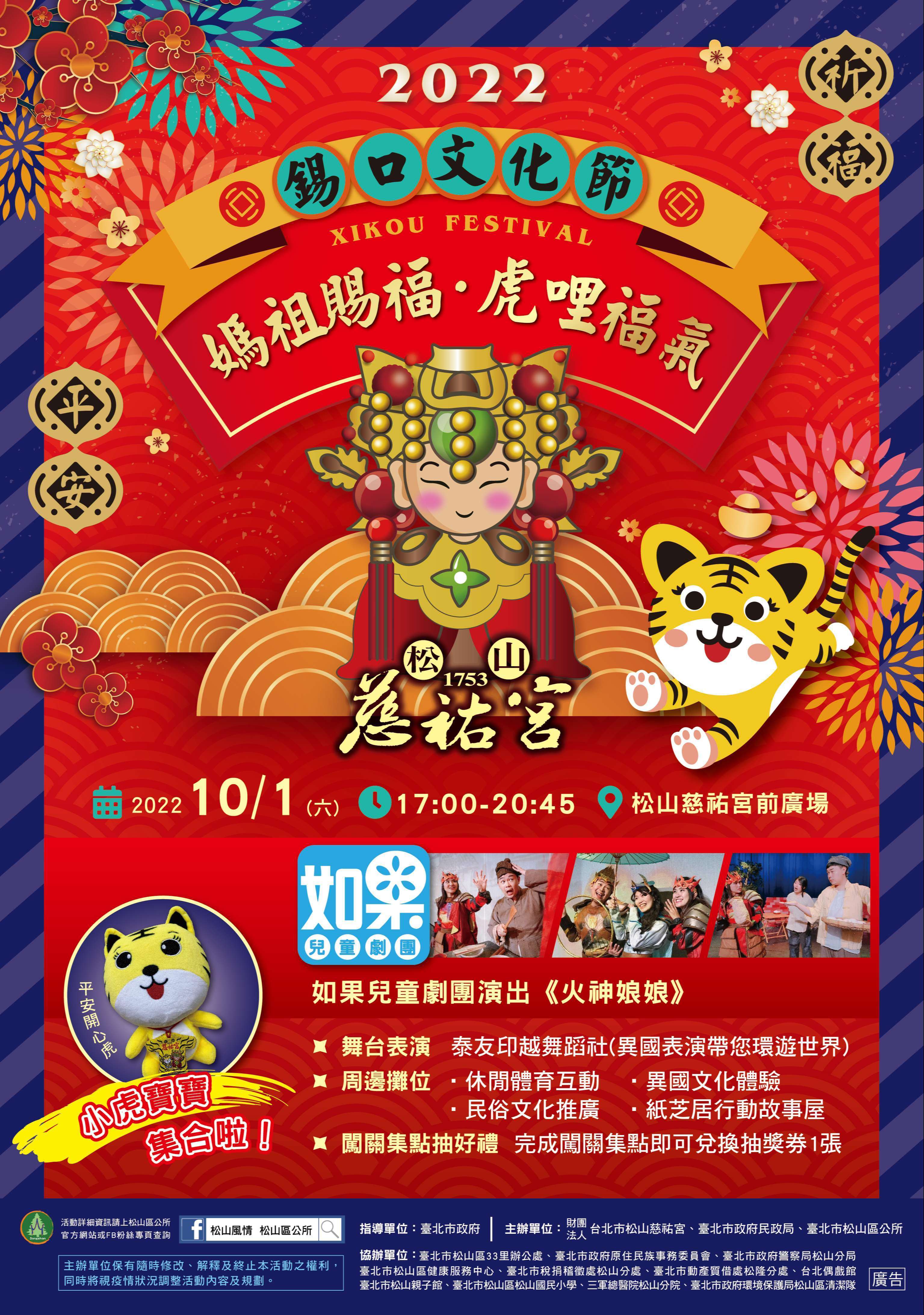 臺北市松山區「2022錫口文化節 媽祖賜福.虎哩福氣」即將登場!活動將於10月1日(六)下午5時至8時45分於松山慈祐宮前廣場舉辦。今年活動特別以「虎年福氣」為規劃主軸,活動當日再次邀請廣受好評的「如果兒童劇團」帶來《火神娘娘》表演,舞台區也有新二代演唱表演、異國風情表演及抽獎活動等;現場周邊攤位將有民俗文物推廣、親子手作DIY、原住民族語教學、紙芝居行動故事屋、復古童玩遊戲及闖關抽獎換好禮等,如此精彩的廟埕活動,誠摯邀請市民朋友同來抓住虎年尾巴得到好福氣。活動詳情請至臺北市松山區公所網站、松山風情臉書粉絲專頁查詢或電洽(02)87878787分機733林小姐。