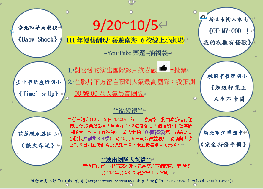 二、旨揭活動同時辦理最佳影片票選及送福袋等活動,活動詳情請逕至該館官方臉書網站(https://www.facebook.com/ntaec/)查詢。