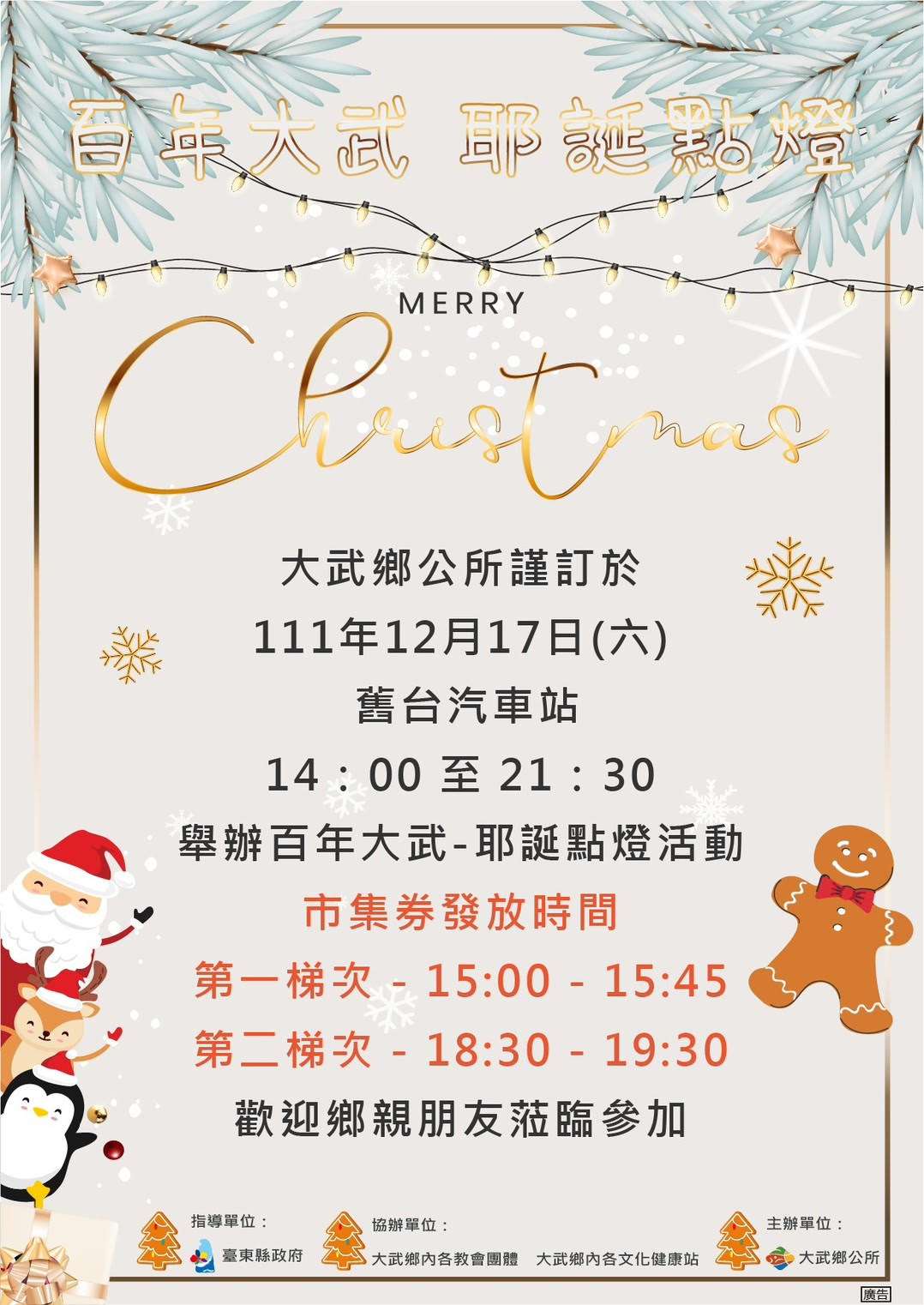 臺東縣大武鄉公所辦理「111年愛來武遊-四季登豐」百年大武耶誕點燈活動,請參閱附件電子海報,並敬請踴躍參與。