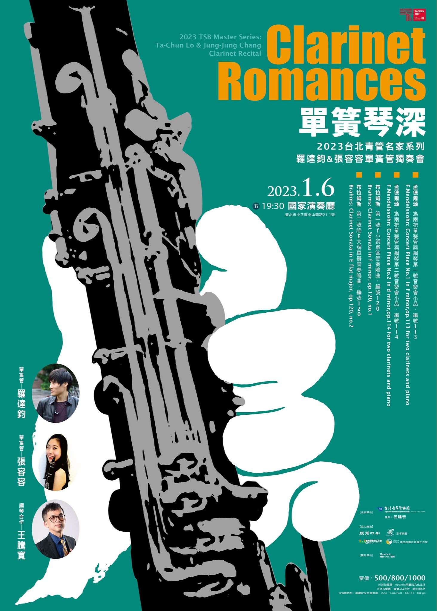一、2023台北青管名家系列,邀請台北青管2團首席單簧管羅達 鈞,與留法單簧管演奏家張容容擔綱獨奏,演奏布拉姆斯2 首單簧管奏鳴曲、與孟德爾頌單簧管2重奏與鋼琴2首音樂 會演奏曲,讓您深入認識單簧管音樂美好。