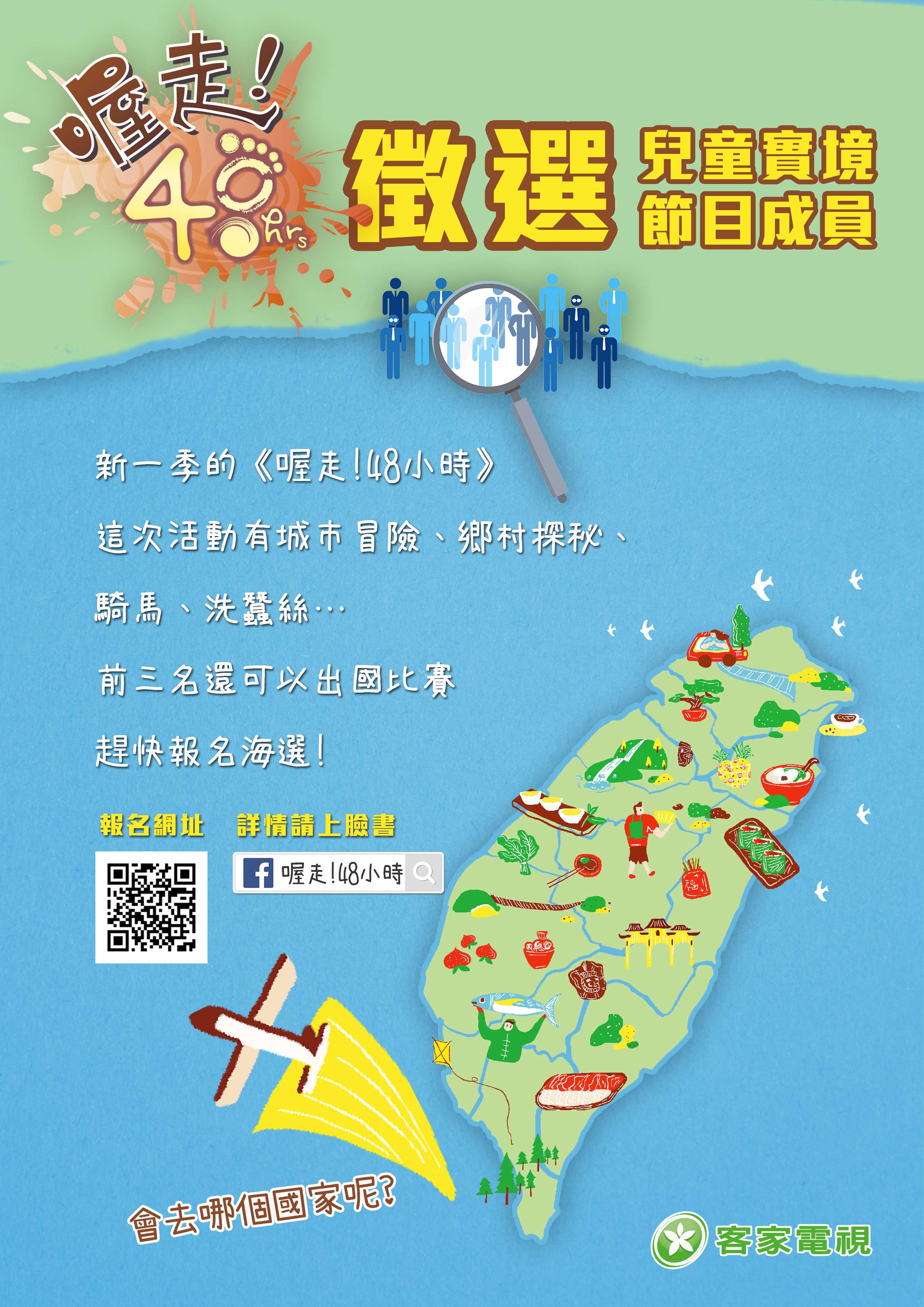 一、《喔走!48小時》是一個以四到六年級學生為主體的實境 節目,每季依據不同的主題設計情境,主要以戶外活動為 主,讓孩子體會在大自然中的樂趣,學習自己解決問題、 團隊合作、完成任務。曾多次獲選臺灣媒體觀察教育基金 會主辦之國人自製兒少節目五顆星,並榮獲兒少發聲獎, 也得到亞洲優質兒童節目入圍等國際肯定。 二、本節目即將展開第十三季拍攝,主題為「勇闖客家庄」, 目前正進行成員徵選,歡迎有興趣的同學報名參加。報名 與活動說明詳見:https://forms.gle /qpoVuPKv8afjryW37。 三、報名截止日期為112年3月10日,並預計於112年3月14日到15日進行海選,詳細時間地點將由製作單位另行通知。 五、如有任何疑問,請洽詢製作單位傳愛家族傳播文化事業有 限公司 (一)楊小姐02-24579231分機13,alice.y927@gmail.com 。 (二)林小姐02-24579231分機19,yun0308@gmail.com 。 (三)或參考節目粉絲專頁https://www.facebook.com /ogo48hrs。