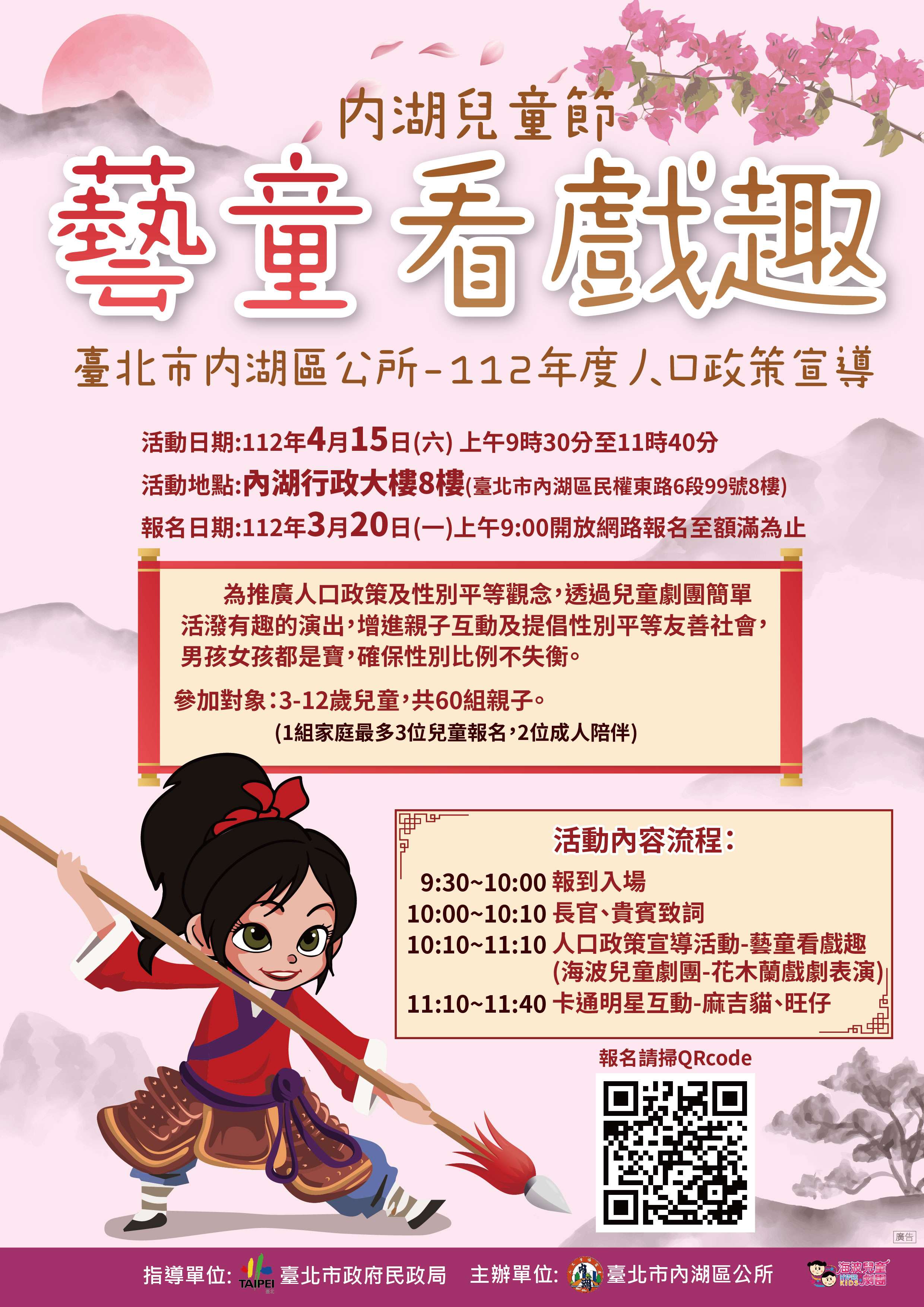 臺北市內湖區公所112年度人口政策宣 導「內湖兒童節-藝童看戲趣」,為推廣人口政策及性別平 等觀念,特別邀請海波兒童劇團演出精采經典大戲「花木 蘭」,