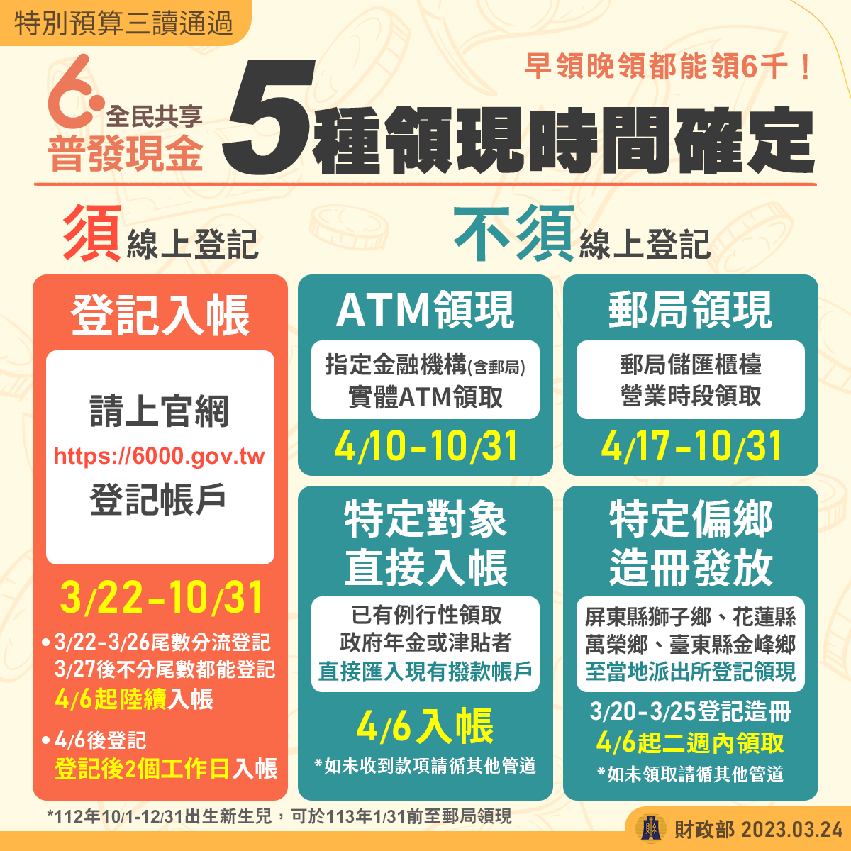 財政部因應國際政經變局、通膨壓力上升與全球經濟衰退風險,恐對社會民生需求帶來衝擊,依「疫後強化經濟與社會韌性及全民共享經濟成果特別條例」第3條第10項規定,辦理全民普發現金,期減輕人民負擔,讓民眾共享經濟成果。依財政部規劃,本(112)年10月31日前符合發放資格者,每人均得領取新臺幣6千元,並採「登記入帳」、「ATM領現」、「郵局領現」、「直接入帳」及「造冊發放」等5種方式,方便民眾領取。