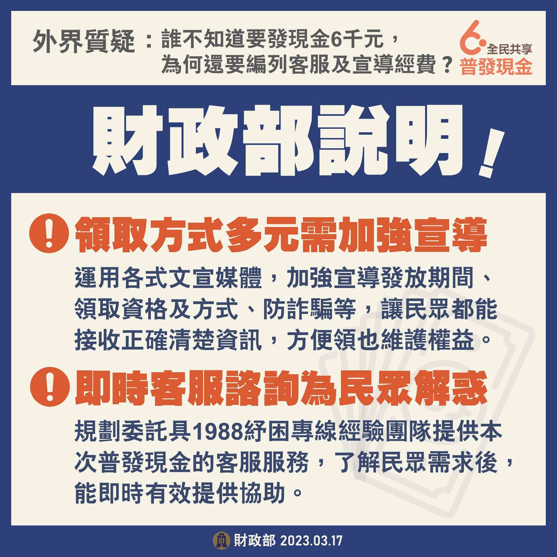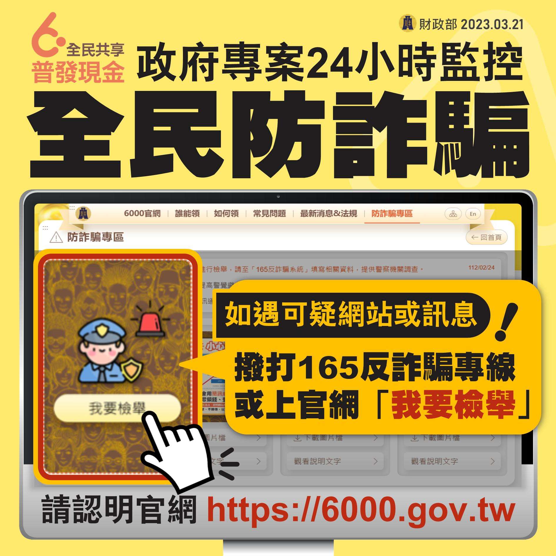 為讓民眾即時取得普發現金正確資訊,避免遭詐騙,除透過新聞稿及記者會加強宣導外,並建置「全民共享普發現金」宣導網站及客服專線「1988」,於本年3月20日正式上線,請參閱附件圖檔及以下影片聯結。