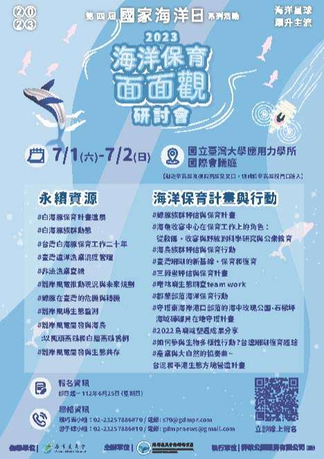 二、查旨揭研討會係訂於112年7月1-2日(星期六-日)假國立臺灣大學應用力學研究所國際會議廳舉行,為鼓勵所屬同仁參與海洋保育事務,海保署將提供全程參與之公務人員終身學習時數;請貴單位轉知所屬於6月25日(星期日)前踴躍報名,並提供出席人員公假參與。