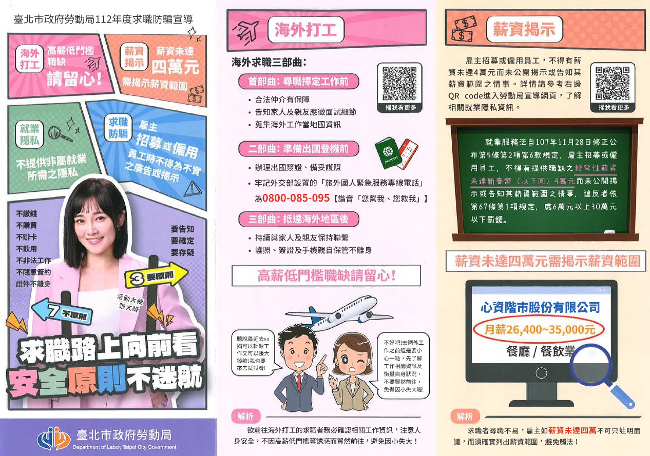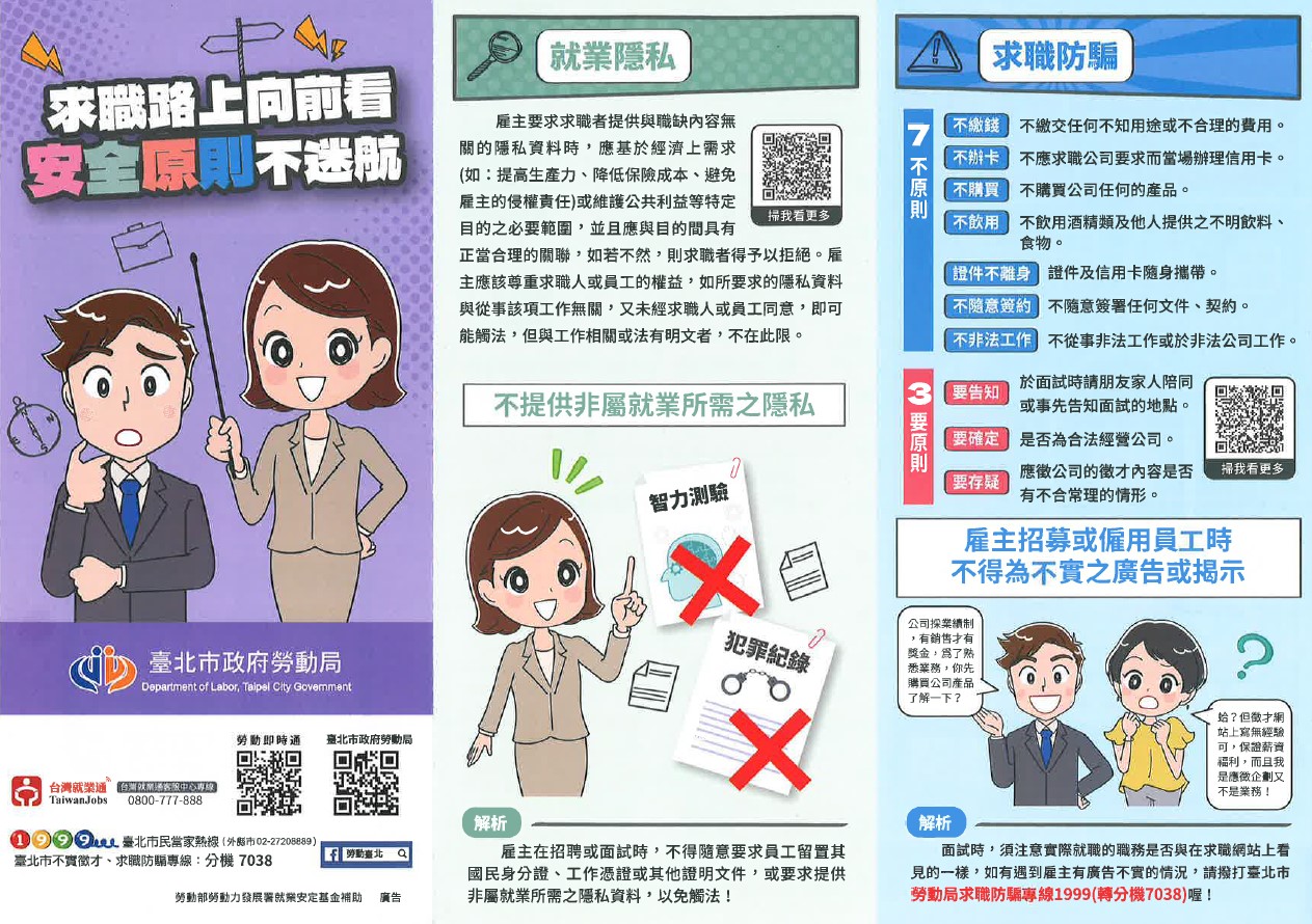 為提升民眾對於不法業者之警覺心及辨識能力,求職時謹 記「7不3要原則」及保護個人就業隱私,避免求職時誤入 求職陷阱。