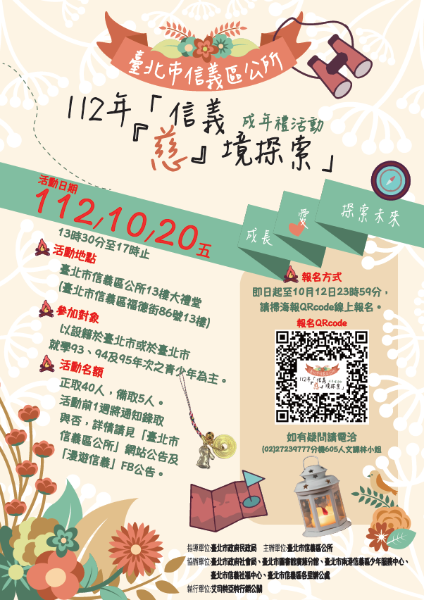 臺北市信義區公所112年度成年禮活動,訂於10月20日(星期五)下午1時30分舉辦,活動為闖關競賽,凡成功報名並全程參與之禮生,可獲得成年禮紀念禮品,並有機會獲得精美獎品。即日起開放報名,內容豐富精彩,歡迎設籍或就讀於臺北市學校之青年男女(民國93至95年次)踴躍報名參加。