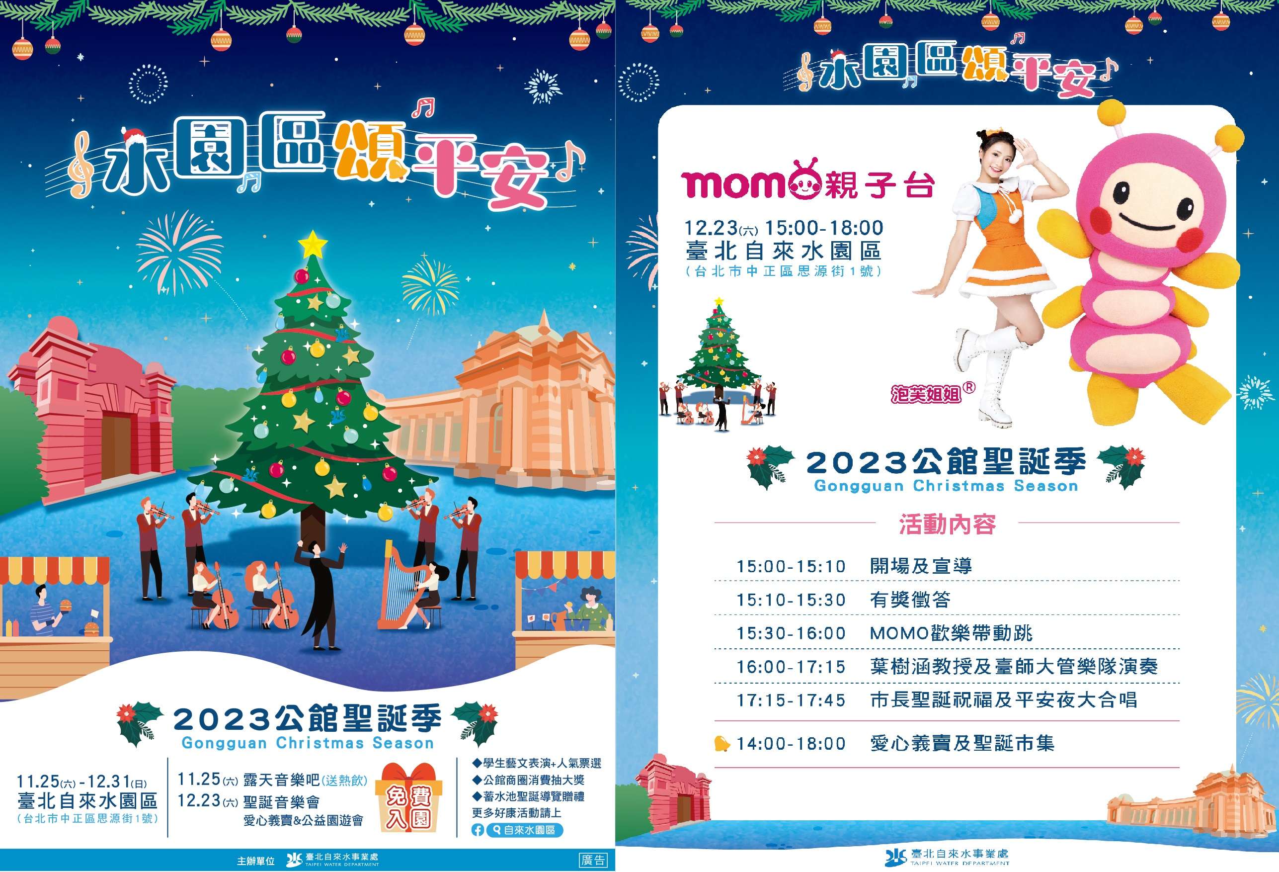 一、2023公館聖誕季12月23日音樂會免費入園,絕美 燈飾伴隨交響樂、眾人合唱平安夜,還有MOMO親子帶動唱、愛心義賣市集,當日商圈抽獎送PS5、IPad等好禮,期待與您共度溫暖平安夜,詳情請見自來水園區粉專。