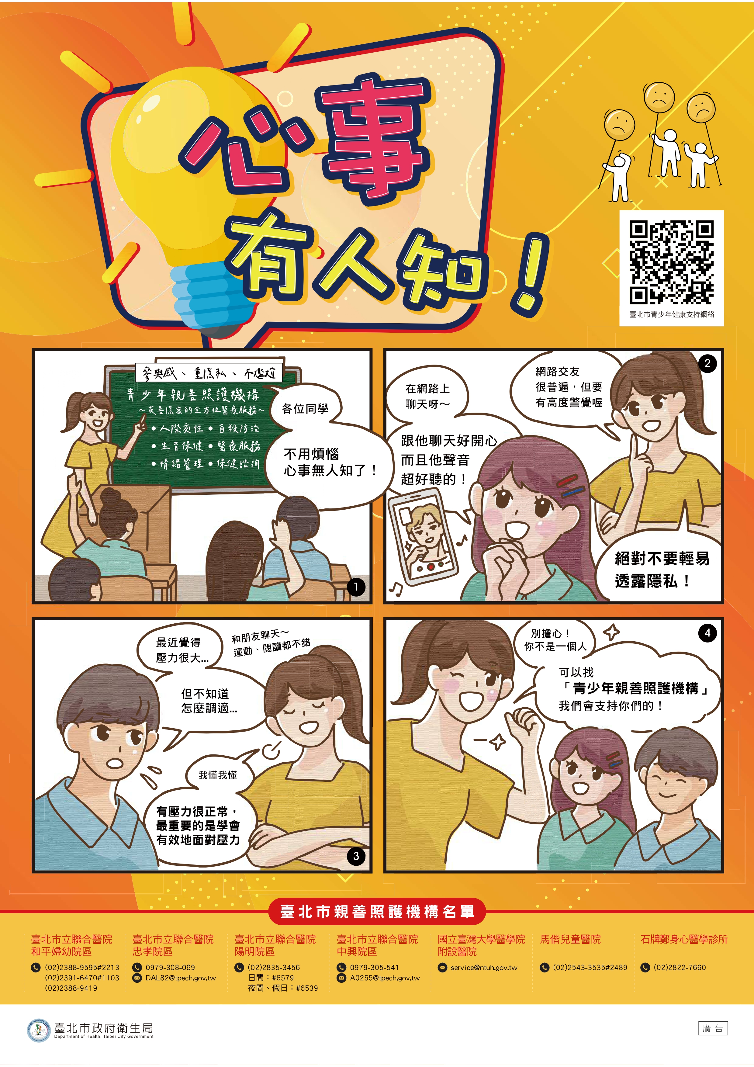 衛生福利部國民健康署自107年起推動「青少年親善照護機 構」認證,將青少年親善照護融入院所健康促進政策,提供青少年健康維護資訊(例如:安全性行為、交友、拒毒、壓力因應、性傳染病、未成年懷孕、網路成癮等高風險疾病),強化青少年參與醫療院所提供的健康照護,使青少年獲得親善及可近性之醫療服務。