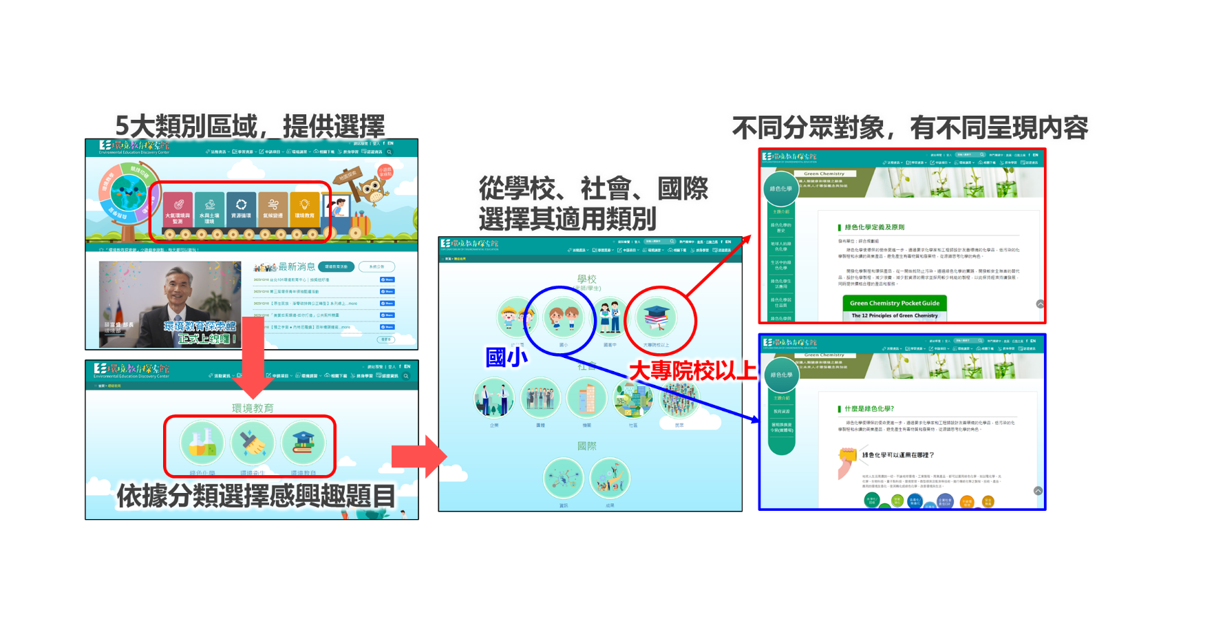 首頁火車箱提供5個主要環境議題提供選擇感興趣內容,包含大氣環境與監測、水與土壤環境、資源循環、氣候變遷及環境教育。為讓使用者能夠更快的看到適合自己使用需求的內容,以學校、社會與國際三種面向細分不同受眾,提供不一樣的主題資料。