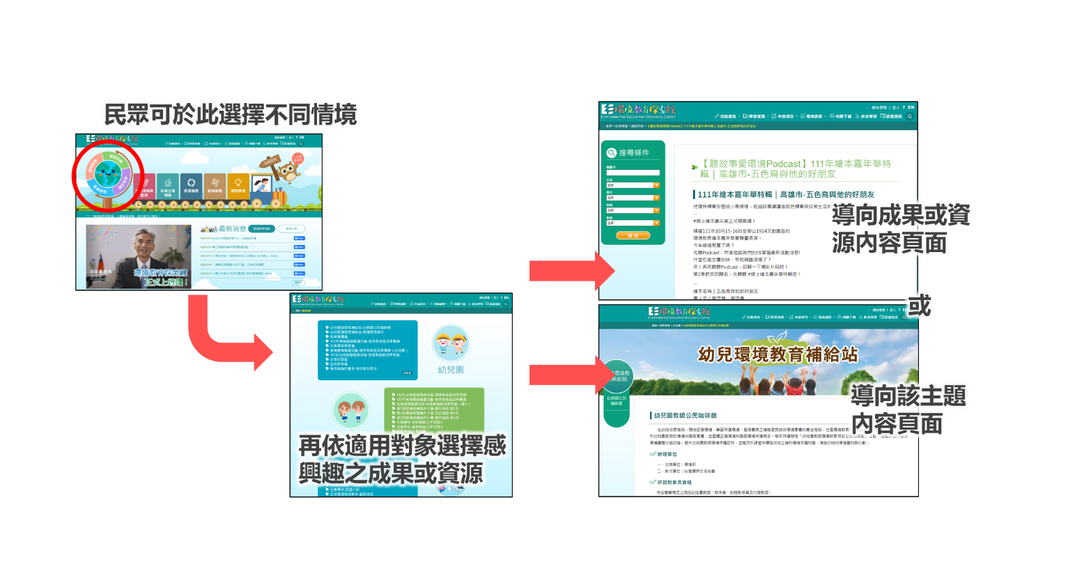 地球儀與周邊環繞四個動態區塊為情境探索之選項,提供使用者依照不同使用情境進行選擇,再依不同適用對象檢視、查詢所需資源;情境探索共有4種情境,各自有不同適用對象與成果資源: