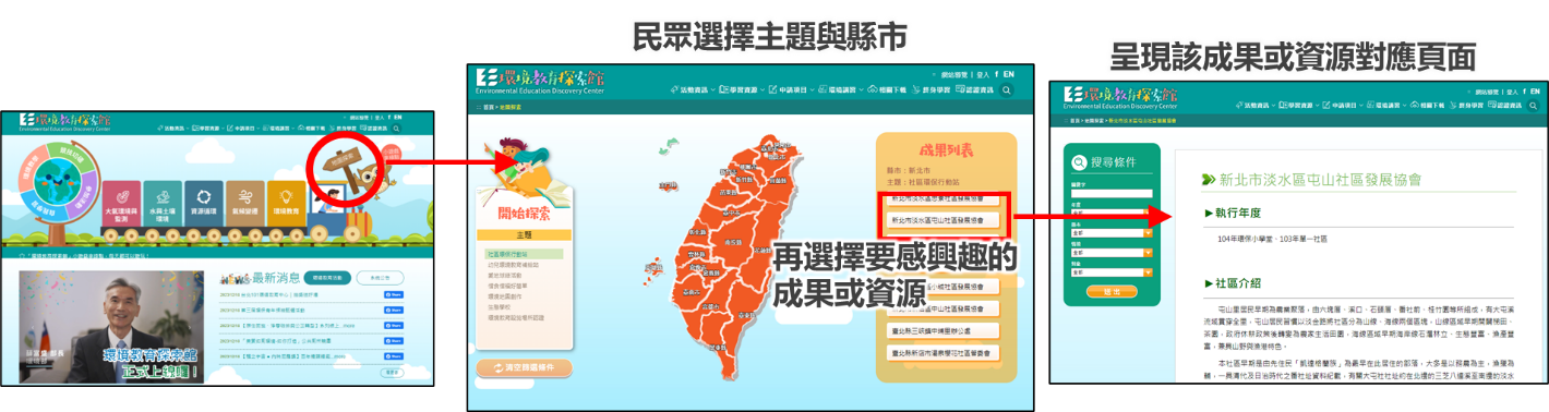 在探索環境教育相關資源過程中,若想要找尋本地或鄰近地區之相關資訊,或依照各縣市查看各種成果,可以透過點選首頁環境教育代言人「鴞博士」手上地圖探索牌子進入探索頁面,即可依照主題與縣市進行成果資源探索。