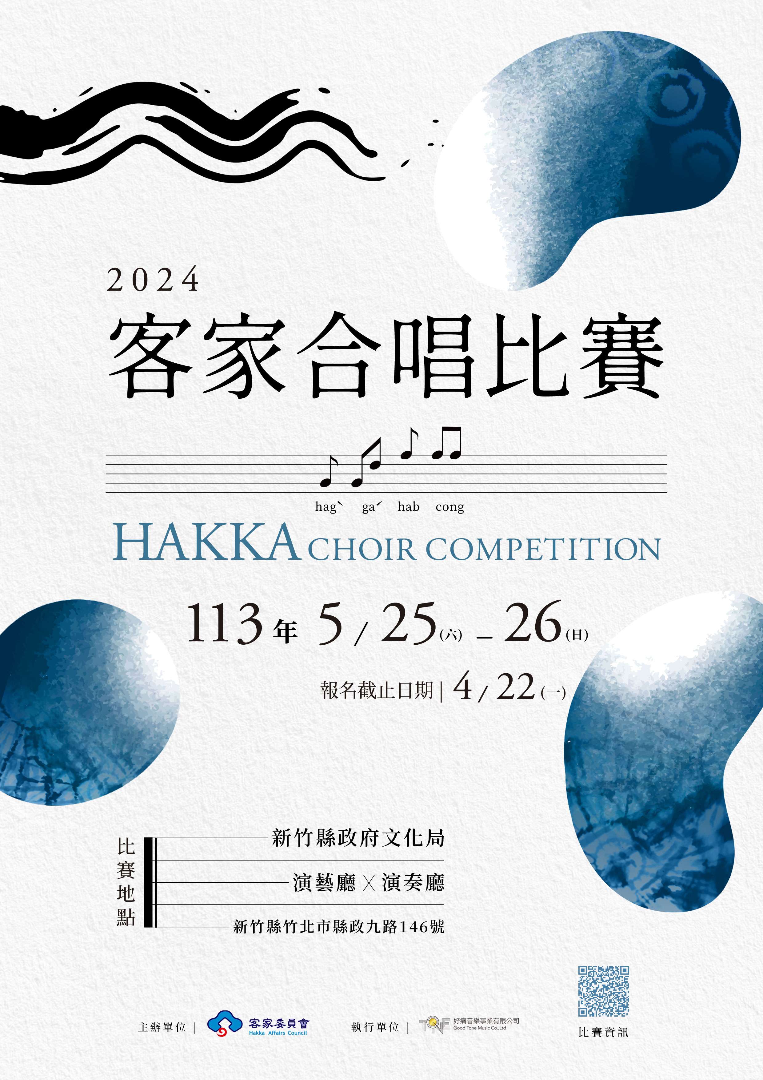 一、客家委員會為推動客家語言與文化永續傳承,訂於113年5 月25日至26日(星期六、日)在新竹縣文化局演藝廳及演奏廳辦理賽事,比賽組別包括合唱類「兒少組」及 「青少組」、現代阿卡貝拉類「學生組」以及傳統山歌類等,報名自即日起至113年4月22日(星期一)止。