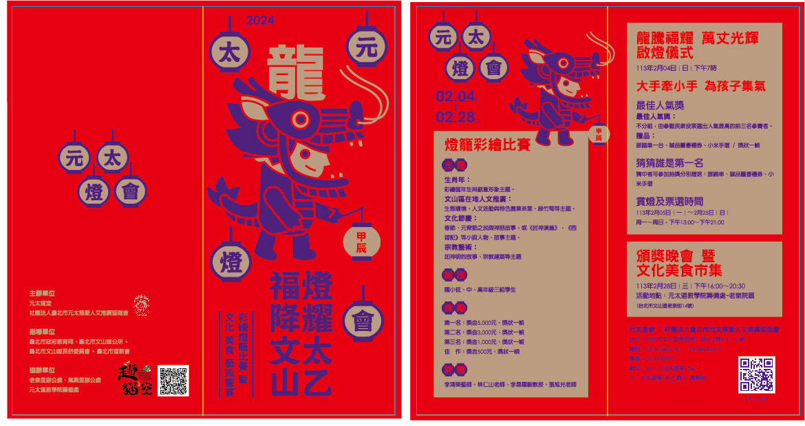 一、2024「福降文山,燈耀太乙」燈會 暨燈籠彩繪比賽,將於113年2月4日晚上7時進行點燈儀式,並自2月5日起至25日開放參觀票選燈籠。