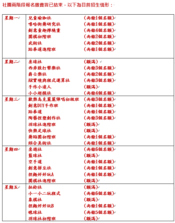 2. 若欲參加社團尚餘名額,可盡速打電話至學務處訓育組(87858111#1630)進行電話報名,以來電報名先後依序錄取