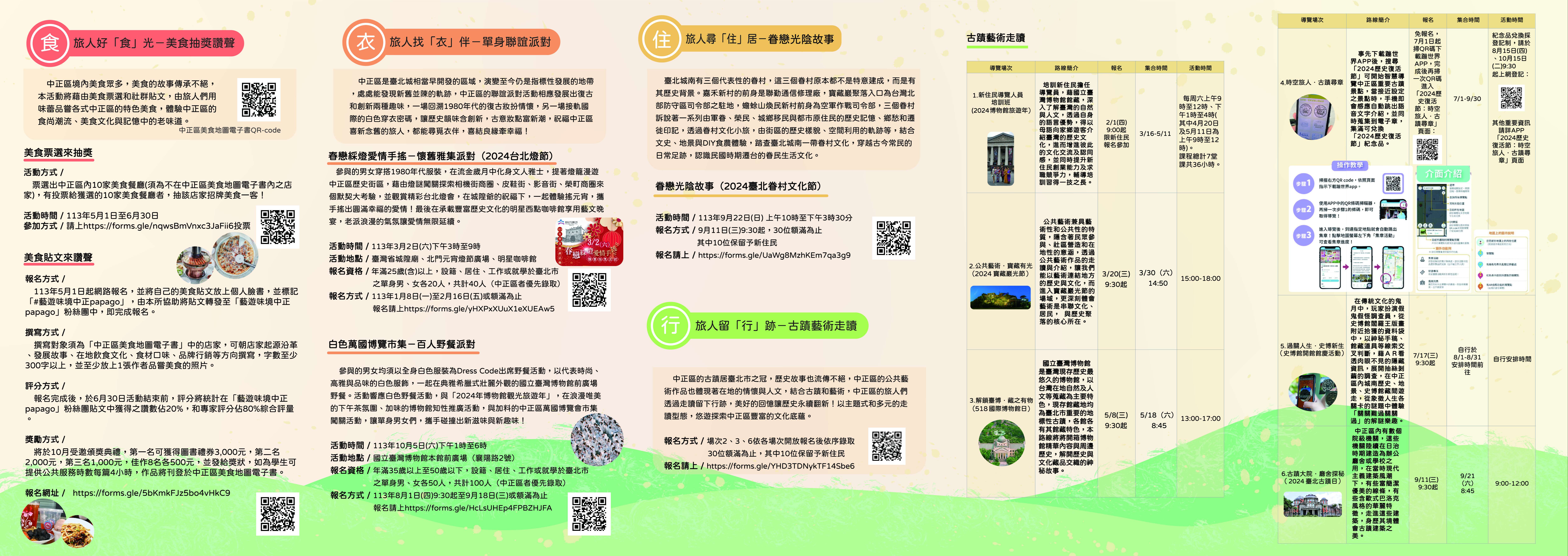 二、詳情請上臺北市中正區公所網站基層藝文專區(https://zzdo. gov.taipei/基層藝文)或藝遊味境中正papago粉絲團 (https://www.facebook.com/papagozhongzheng)查詢,或電洽02-23416721分機316張小姐。