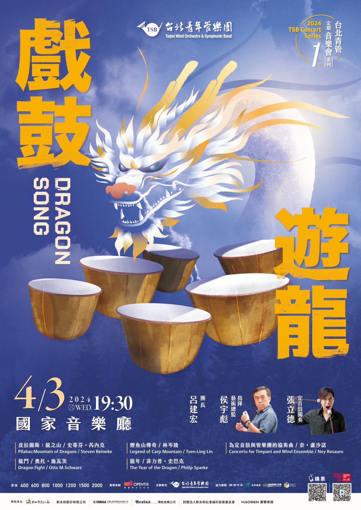 一、2024台北青管定期音樂會系列I,由侯宇彪教授指揮台北青年管樂團演出;帶來多首與東西方神獸龍有關之樂曲, 氣勢磅礡。並邀請廣州交響樂團定音鼓首席張立德擔任協奏曲獨奏,精彩可期。