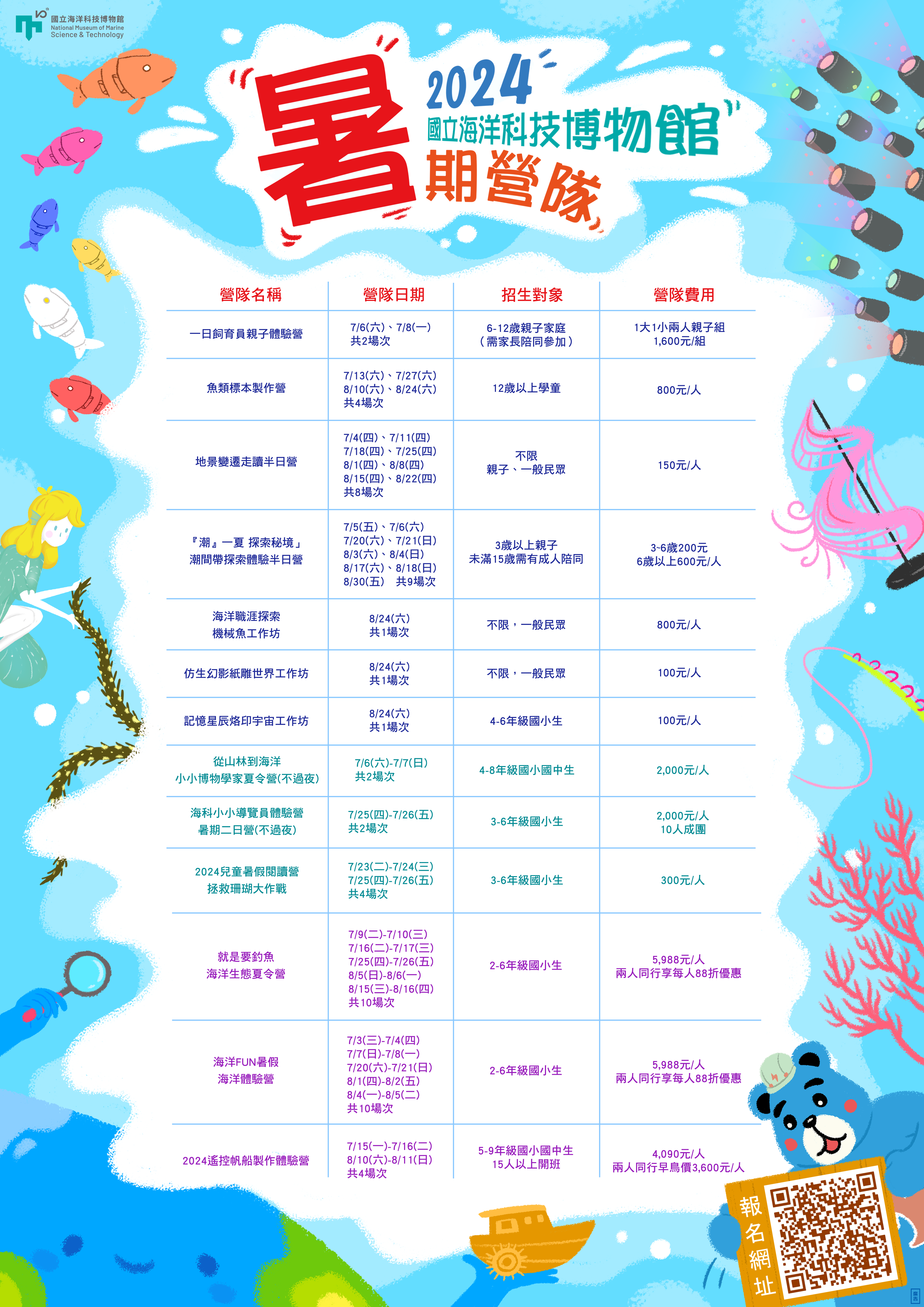國立海洋科技博物館具有山海的自然景觀之外,亦有海洋科技、文化、生物與環境等課程資源,為提供全民優質的課程體驗,於113年7月3日至8月30日期間,推出一系列暑期營隊活動,希望 全民可以在沉浸式的情境中,度過一個不一樣的暑假。