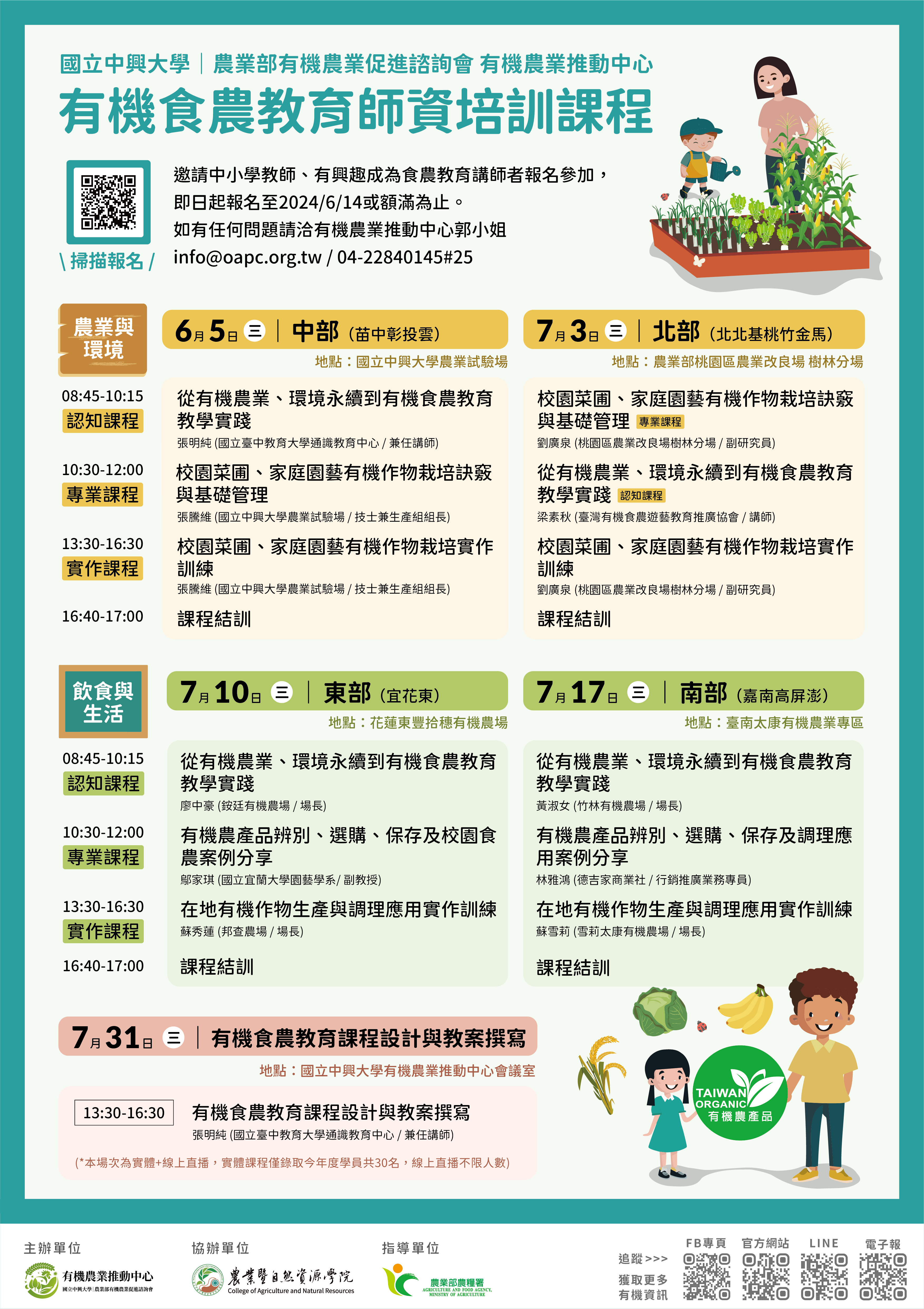 (五)113年7月31日(星期三)13:30-16:30,「有機食農教育課程設計與教案撰寫」(實體暨線上直播),課程地點:國立中興大學有機農業推動中心會議室。