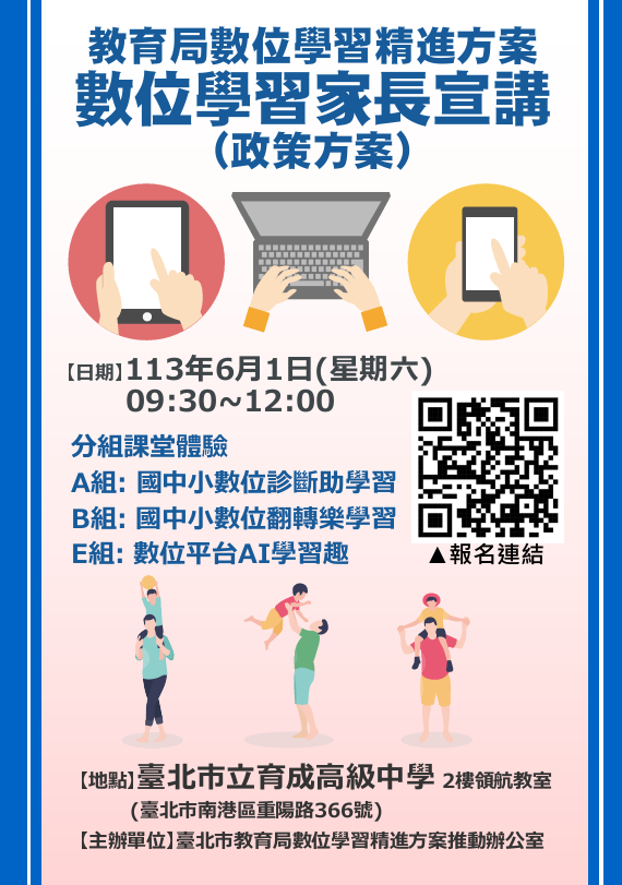 二、依教育部執行「推動中小學數位學習精進方案」,補助縣市政府及學校學習載具、購置數位內容與教學軟體、成立數位學習推動辦公室及辦理教師培訓等事項,為利家長了 解中小學數位學習推動政策與現況,特辦理旨揭活動。