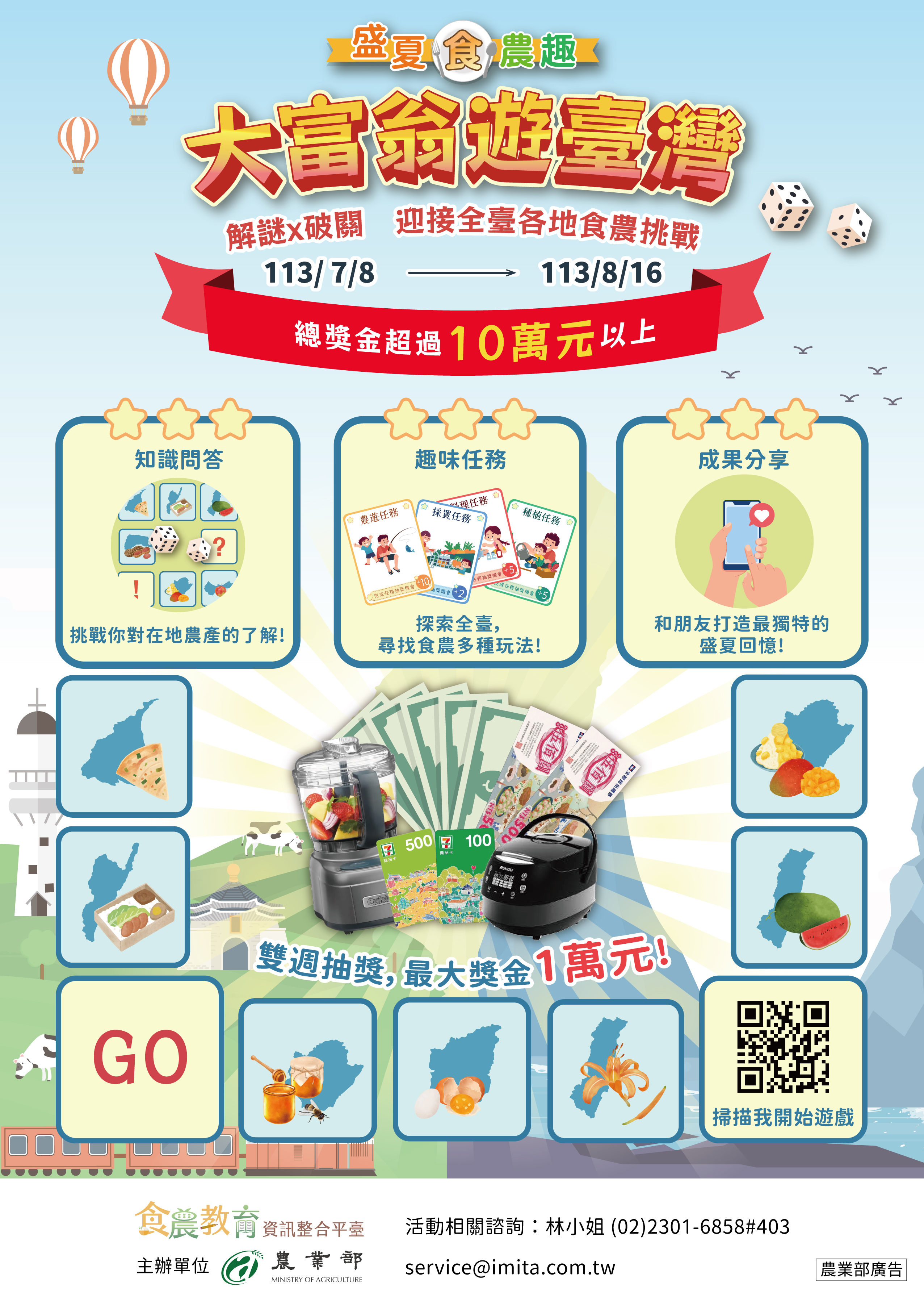 為促使大眾更加瞭解食農教育,農業部訂於113年7月8日至 8月16日舉辦「盛夏食農趣:大富翁遊臺灣」食農教育推廣活動(網址:https://fae.moa.gov.tw/2024event/),提供食農教育相關知識問答、任務體驗與成果分享等遊戲,參與活動即可抽獎,總獎金超過10萬元,有興趣者歡迎踴躍參與。