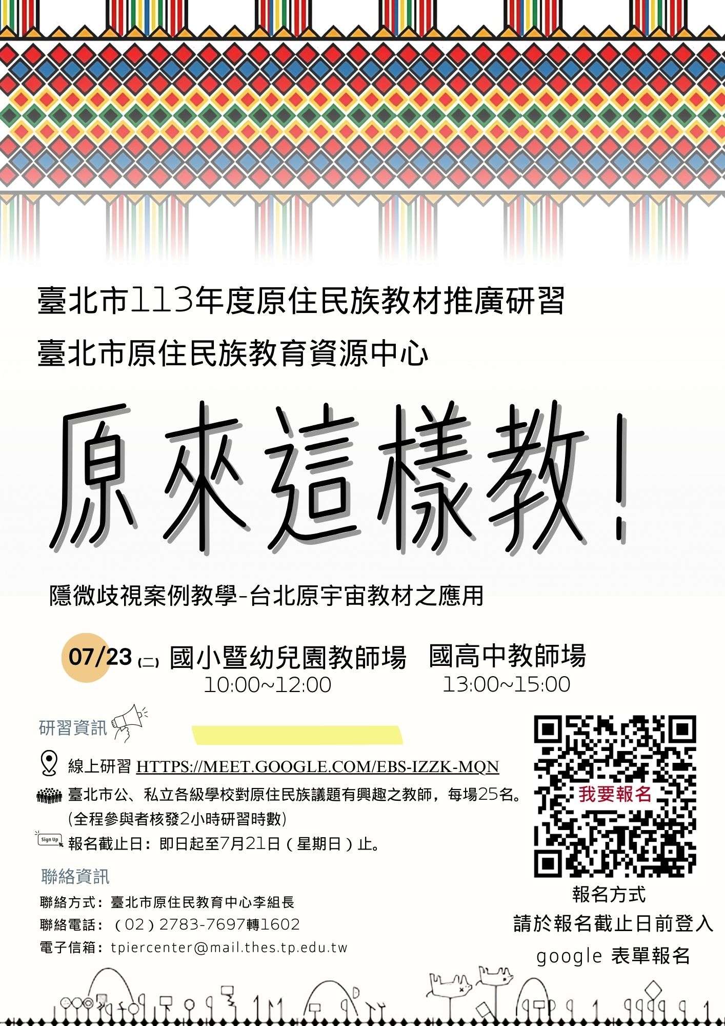 2、國高中教師下午場:113年7月23日(星期二)13:00~15:00。