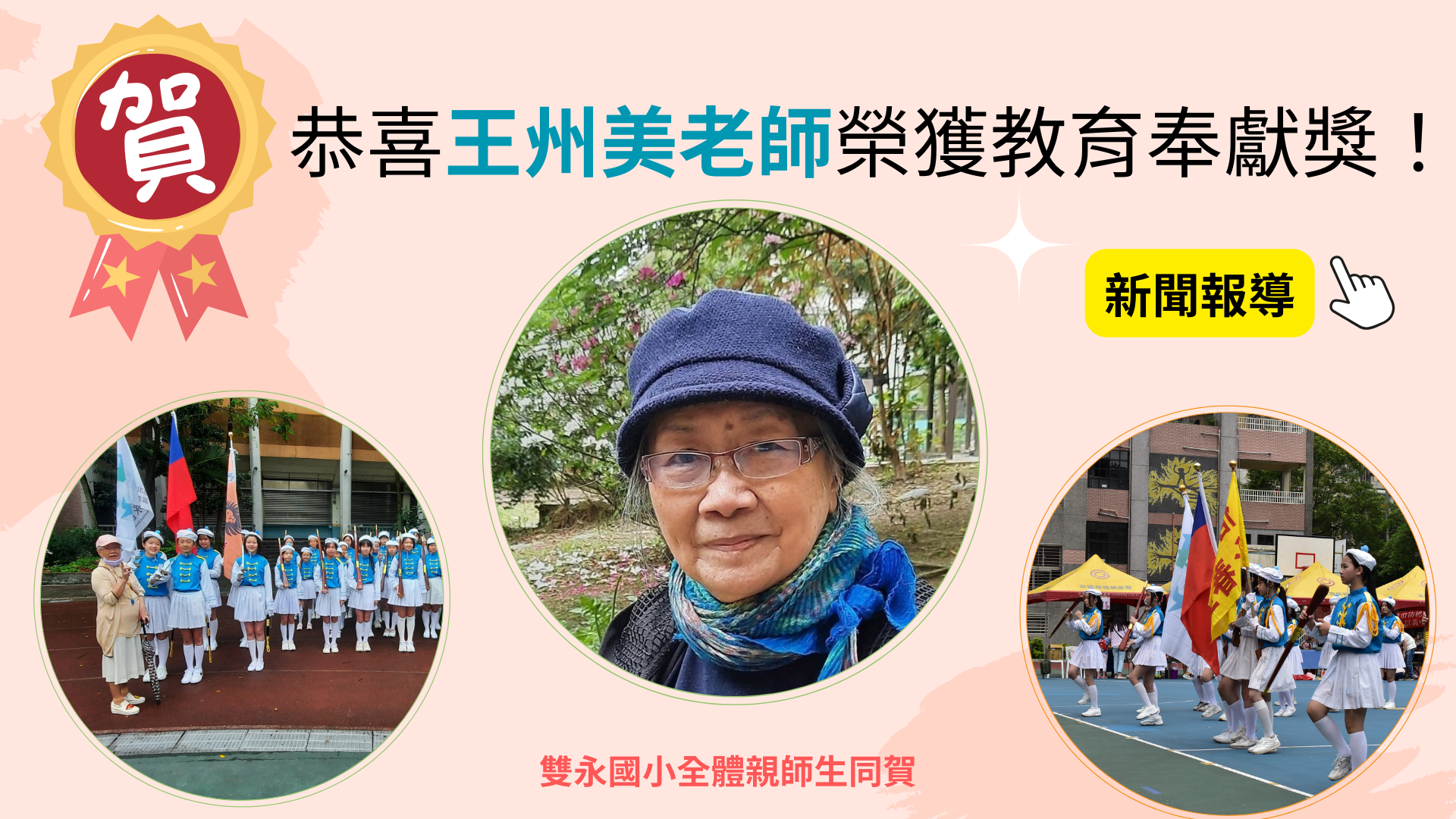 賀!本校退休老師(現任儀隊指導老師)王州美老師,榮獲教育部113年第19屆教育奉獻獎.全國僅二十人得獎,可喜可賀!雙永國小全體親師生同賀