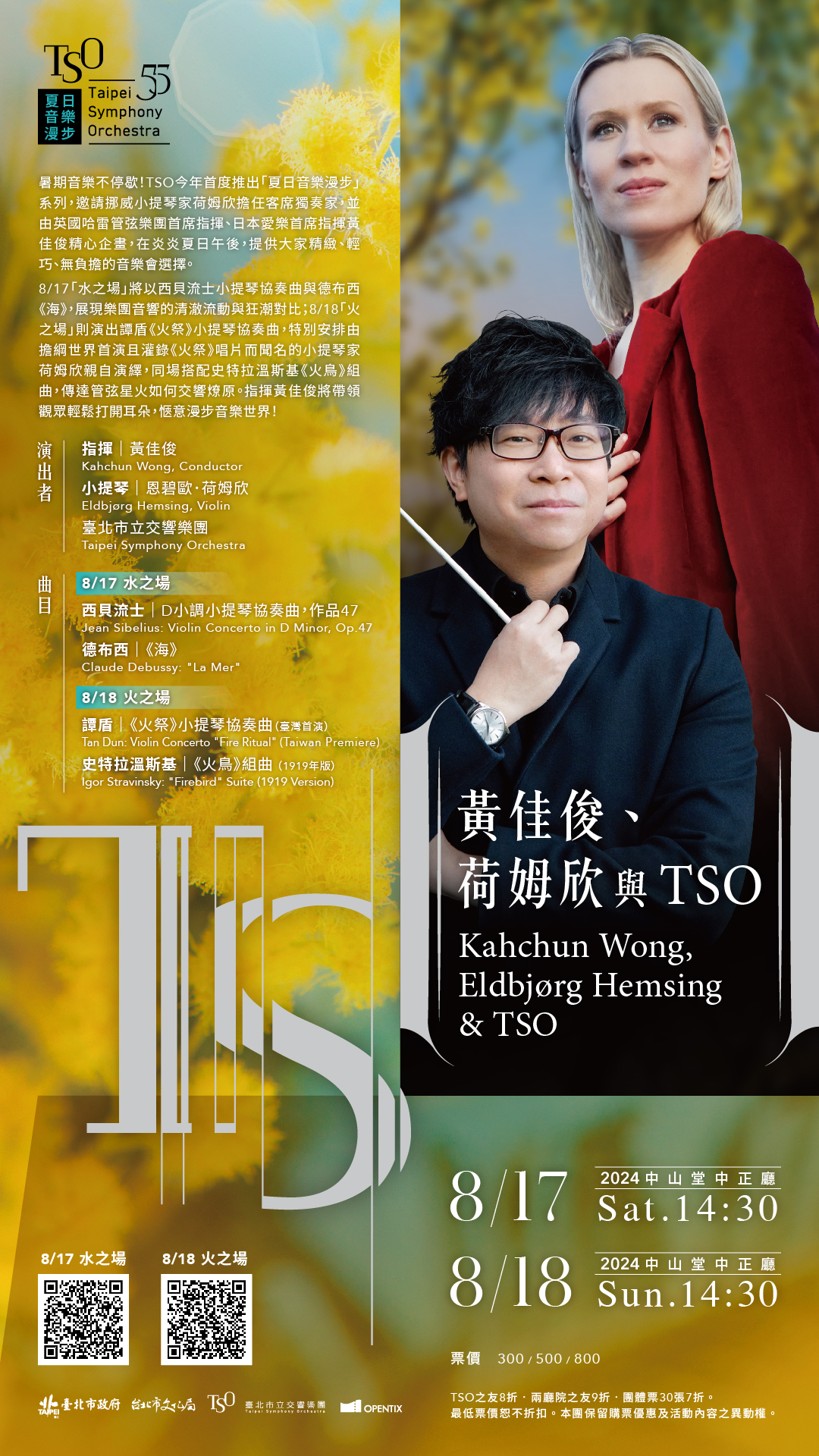 黃佳俊、荷姆欣與TSO (水之場、火之場)音樂會為臺北市立交響樂團今年推出之全新【TSO夏日音樂漫步】系列活動,特別邀請現任日本愛樂交響樂團首席指揮黃佳俊(Kahchun Wong),攜手挪威小提琴家恩碧歐·荷姆欣(Eldbjørg Hemsing)同臺演出,這次全新設計輕巧的音樂會內容,只需一段悠閒的下午茶時間,無中場休息加上指揮分享,輕鬆欣賞古典音樂,提供夏日午後另一種休閒選擇。本次音樂會公務人員享有八折優惠、學生享有購票七折優惠,歡迎蒞臨聆賞。水之場演出資訊:https://s.opentix.life /p/P649b8b59、火之場演出資訊:https://s.opentix. life/p/P70e3701b。