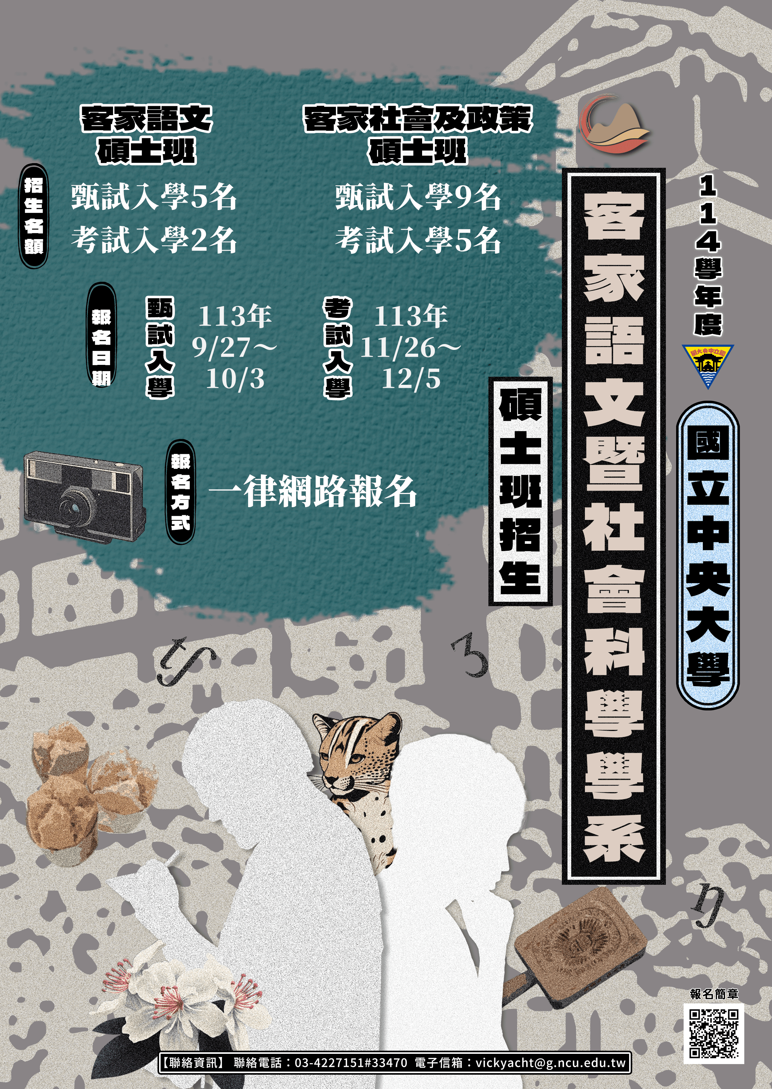 一、國立中央大學客家語文暨社會科學學系「客家語文碩士班」及「客家社會及政策碩士班」114學年度招生,分為甄試及考試入學兩種方式,並一律網路報名。