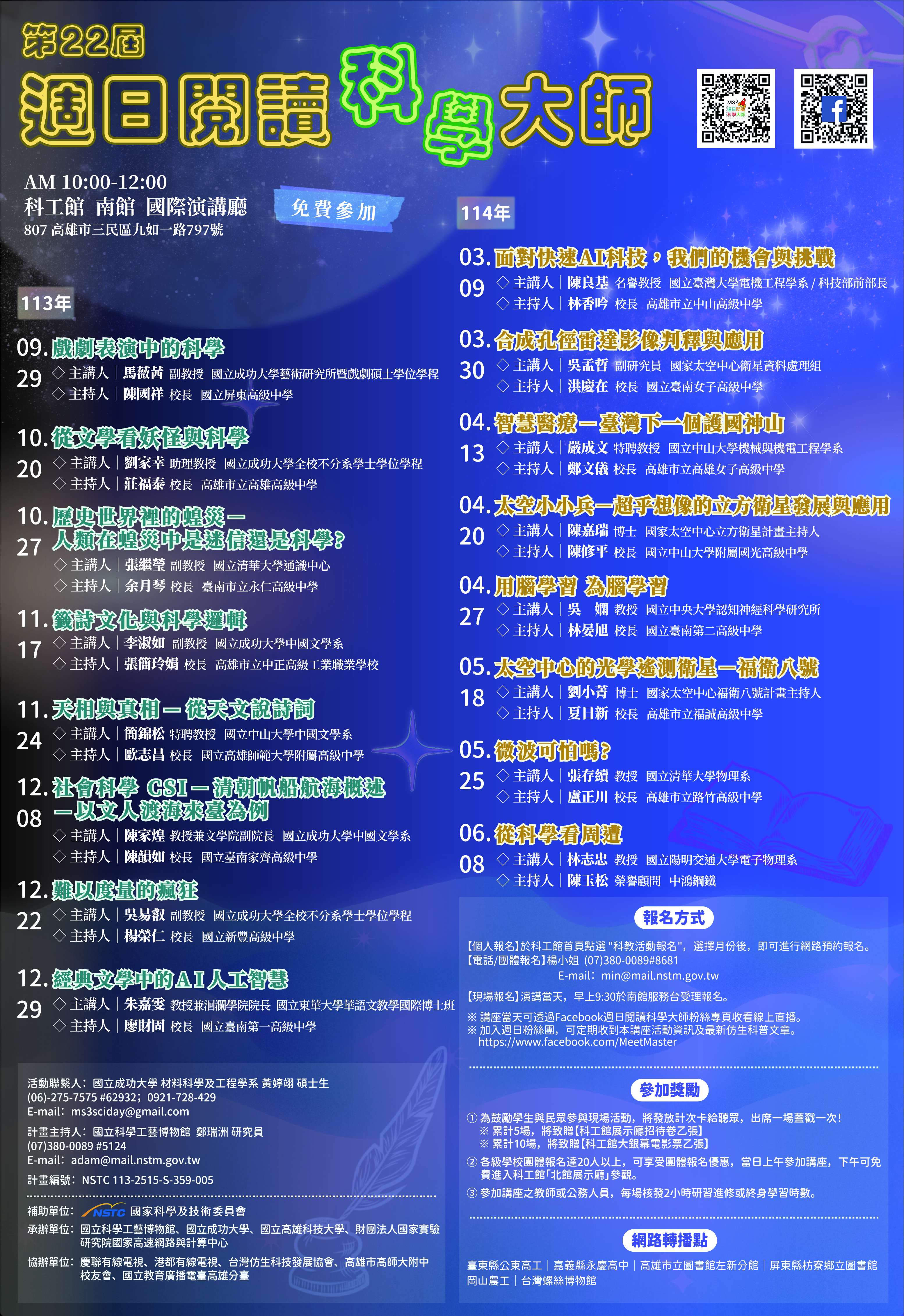 一、「週日閱讀科學大師」講座是專為年輕朋友及社會大眾辦理之科普活動,目的為引發學生及社會大眾對於科學的理解、興趣及參與,以增進其科學素養。