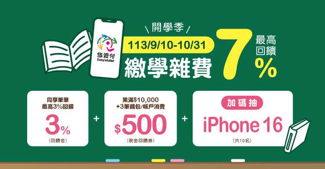 (2)加碼抽iPhone活動期間:凡使用悠遊付繳學雜費即可參加抽獎,抽獎獎項iPhone 16,共10名。