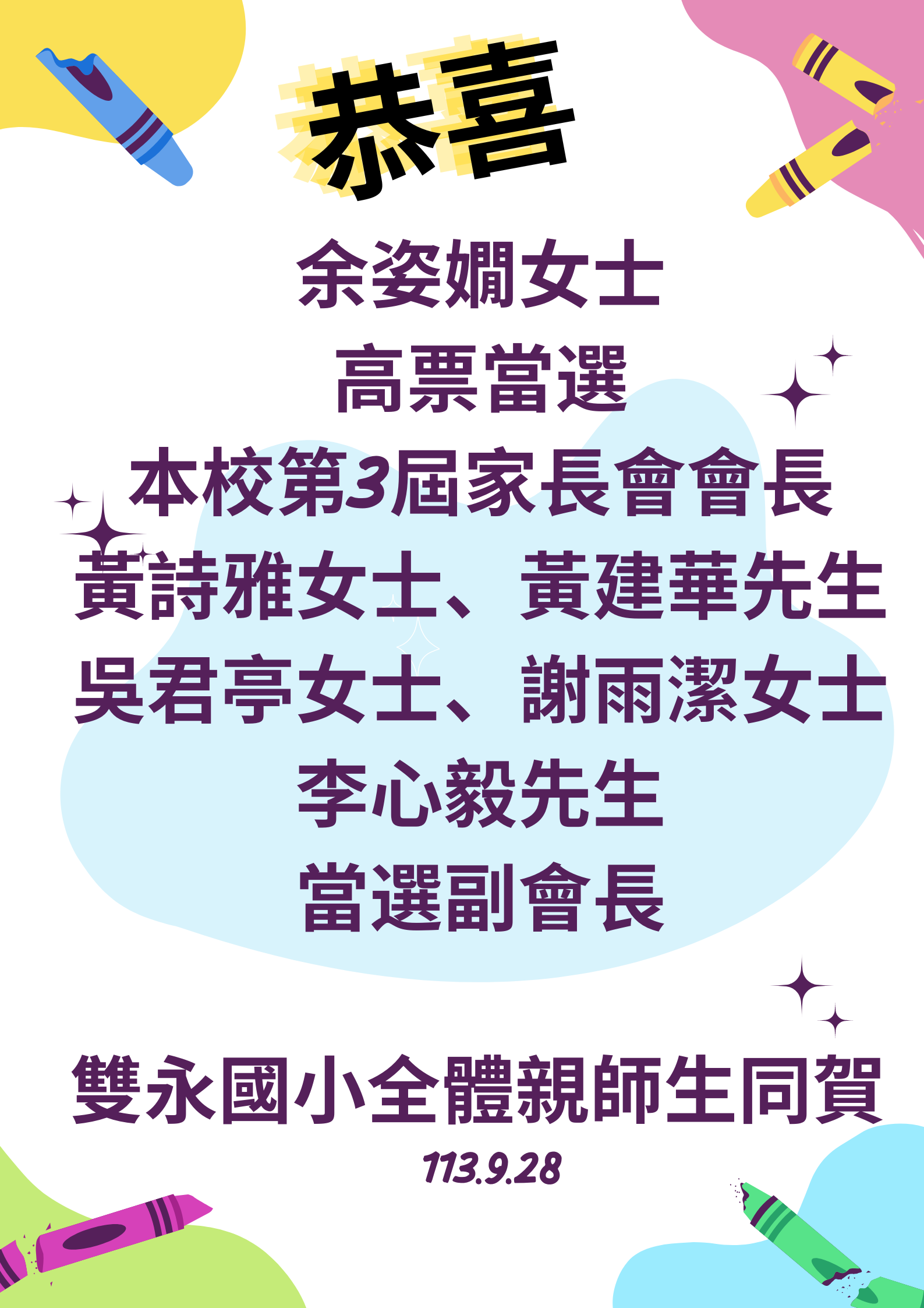 恭喜余姿嫺女士高票當選本校第3屆家長會會長,黃詩雅女士、黃建華先生、吳君亭女士、謝雨潔女士、李心毅先生當選副會長,雙永國小全體親師生同賀!