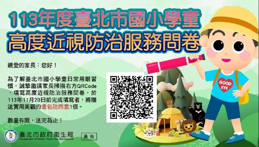 衛生局為了解本市國小學童日常用眼習慣,誠摯邀請家長(掃描QRcode如附件)填寫高度近視防治服務問卷。於113年11月20日前完成填寫者,將贈送實用美觀的 書包防雨套1個數量有限,送完為止!
