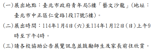 「113學年度全國學生美術比賽」獲優等及甲等之作品展覽於臺北市政府青年局5樓「藝文沙龍」,歡迎前往欣賞。