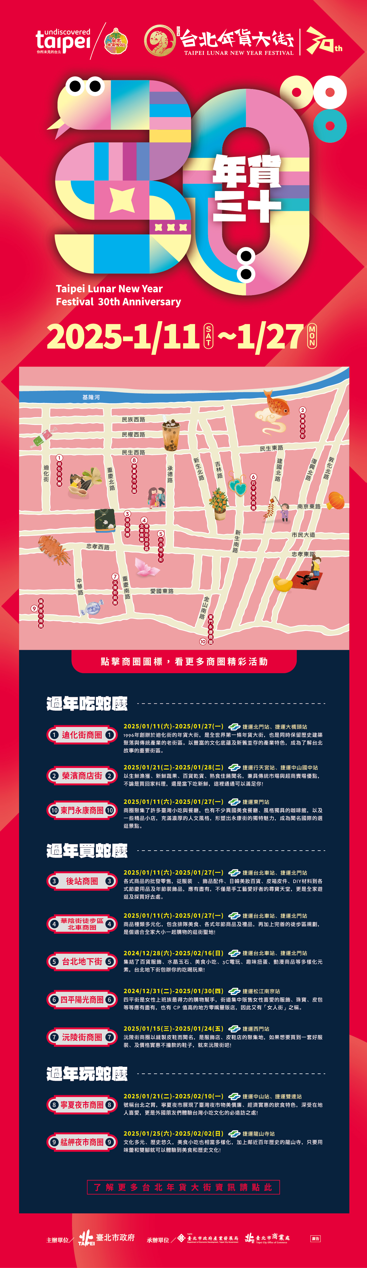 (一)活動時間:114年1月11日至114年1月27日。(二)活動地點:本市迪化街商圈等10處商圈場域。(三)活動官網:https://www.2025taipeilunarnewyear.taipei