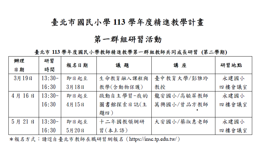 三、報名方式:請逕自臺北市教師在職研習網報名(https://insc.tp.edu.tw/),敬請貴校惠允參加教師公假出席。每場次全程參與者核予3小時研習時數。