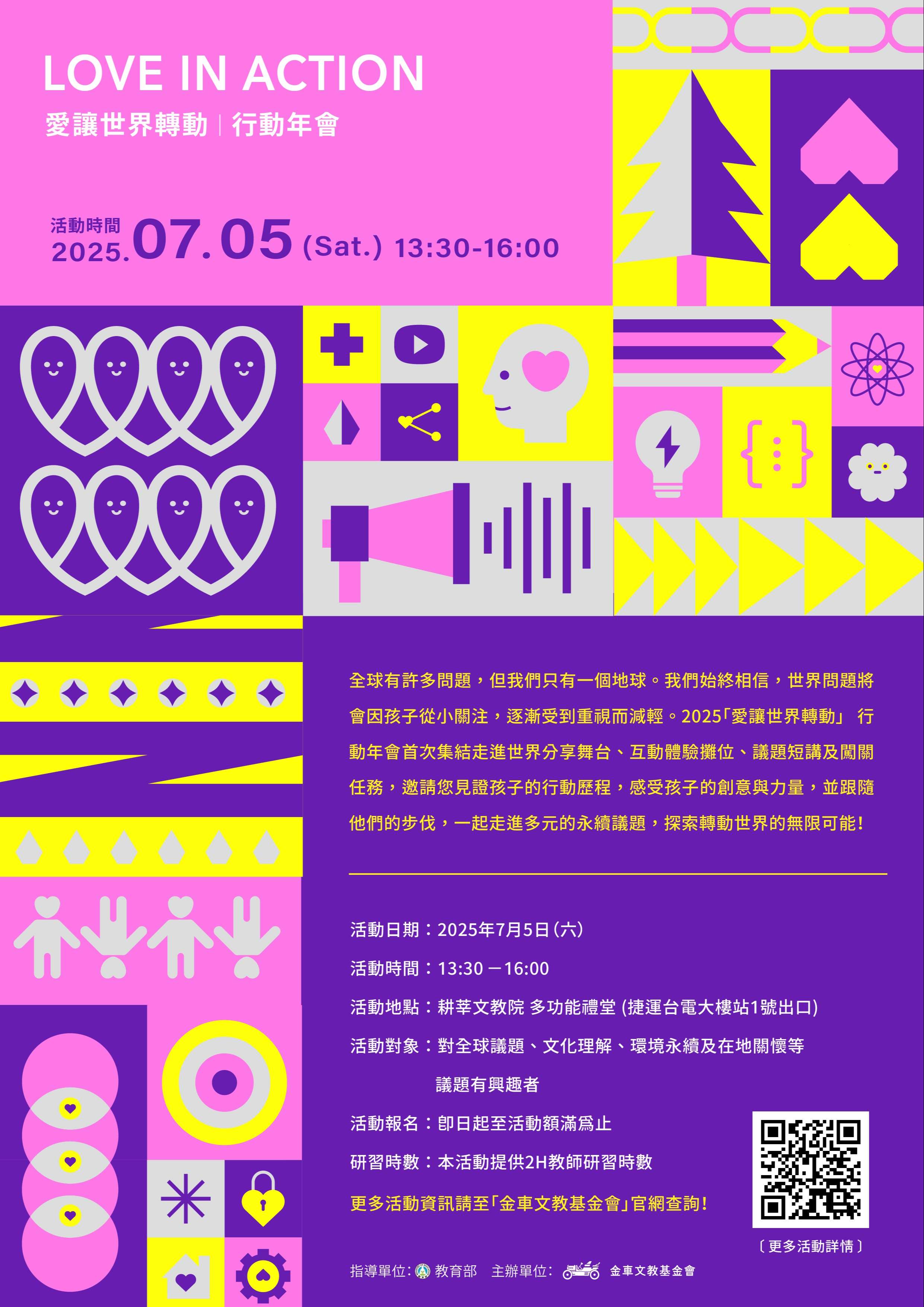 一、金車文教基金會長期推動「愛讓世界轉動」計畫,鼓勵老師陪伴孩子以國際視野、在地行動,走出教室落實社會關懷。2025「愛讓世界轉動」行動年會活動特別集結獲獎團 隊師生行動成果,現場設有15個互動體驗攤位、4大議題專 家短講及闖關任務等豐富活動,教您如何透過教學設計與 課堂實踐,連結在地與國際重要的永續議題,打造有感的 學習氛圍,攜手孩子走進地方、邁向世界。