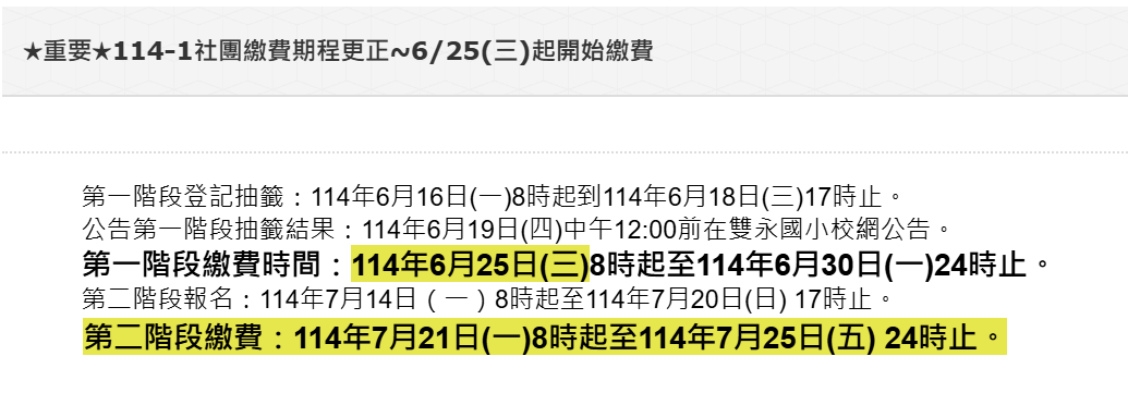 3.繳費時程變更,第一階段繳費時間從6/25(三)開始,再請留意繳費時間,若未在時間內繳費,名額將釋出給第二階段報名。