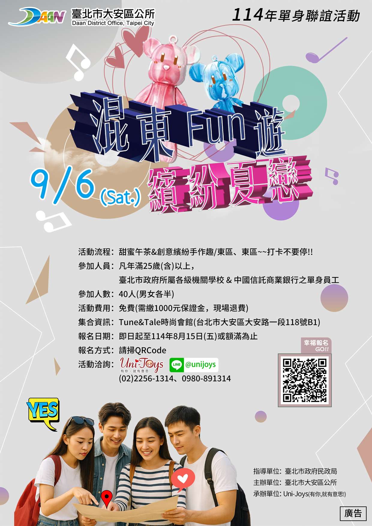 一、旨揭活動訂於114年9月6日(星期六)下午13時至17時30分 於Tune&Tale時尚會館(臺北市大安區大安路1段118號地下 1樓)及臺北東區商圈舉行,自即日起至114年8月15日(星期五)或額滿為止。