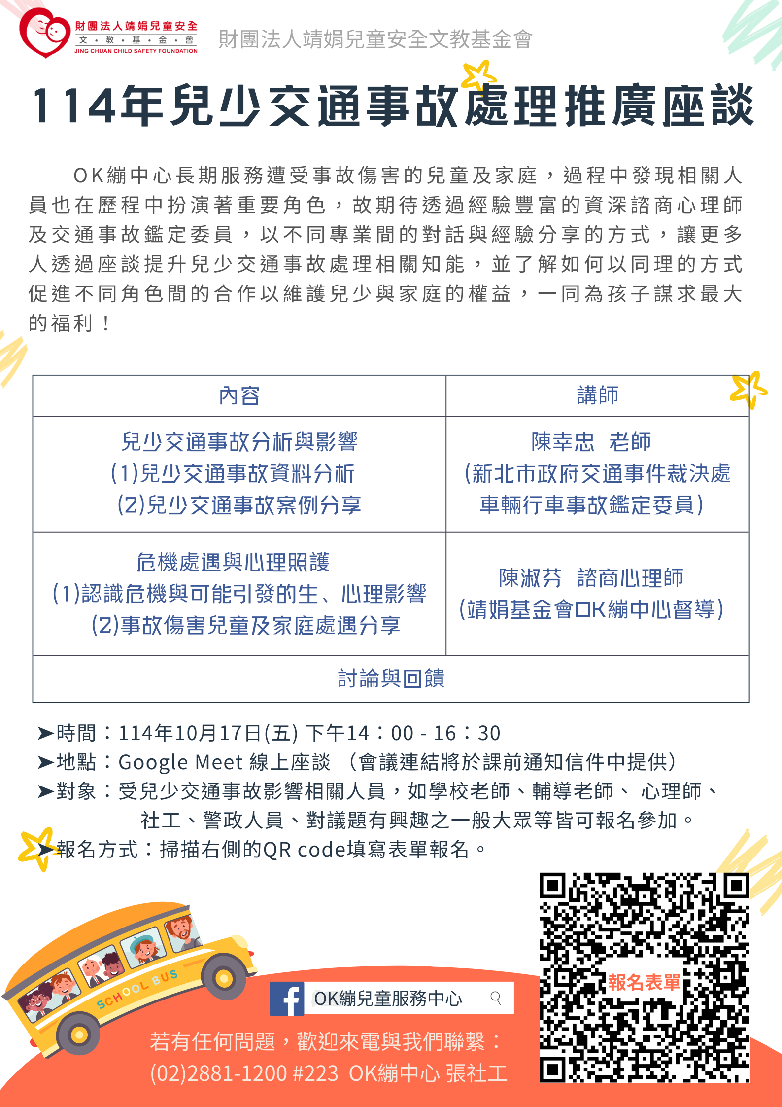 OK繃兒童服務中心將於10月17日辦理「114年兒少交 通事故處理推廣座談」