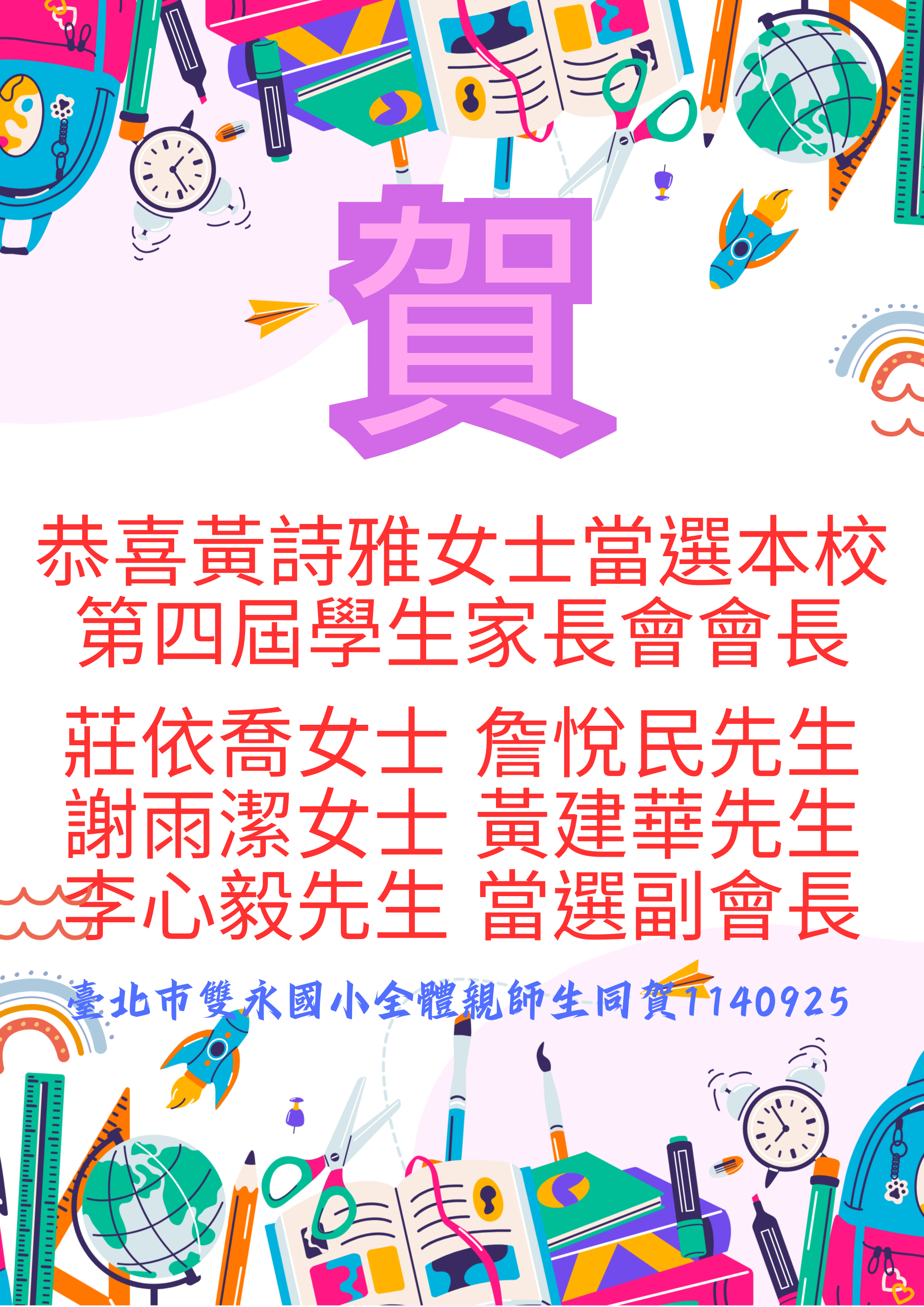 恭喜黃詩雅女士高票當選本校第4屆學生家長會會長,莊依喬女士、詹悅民先生、謝雨潔女士、黃建華先生、李心毅先生當選副會長,雙永國小全體親師生同賀!