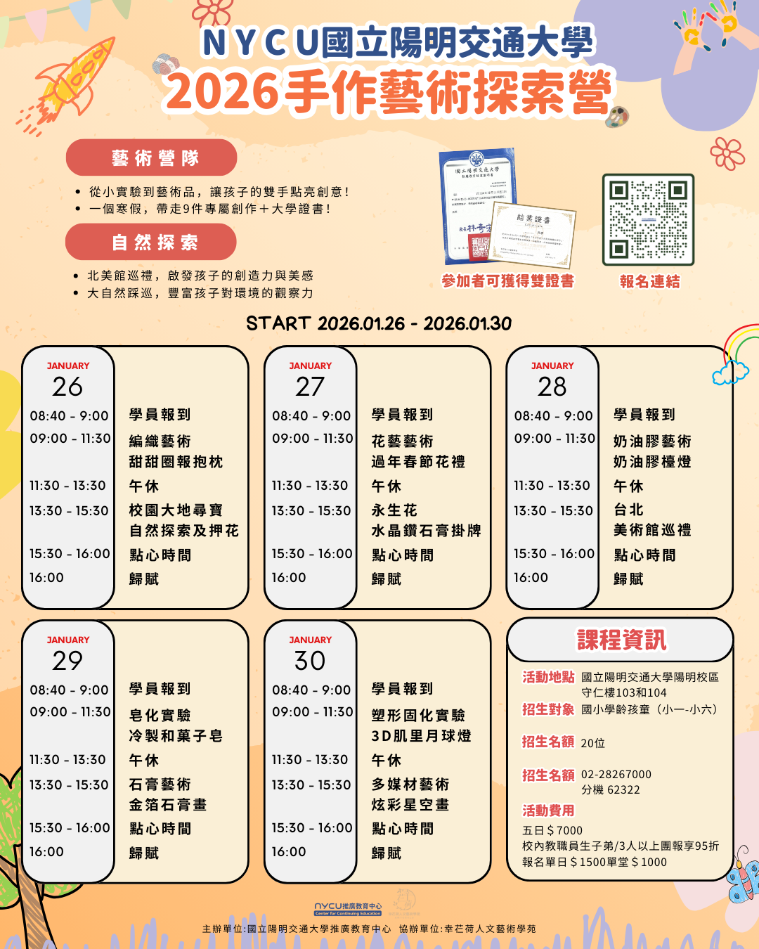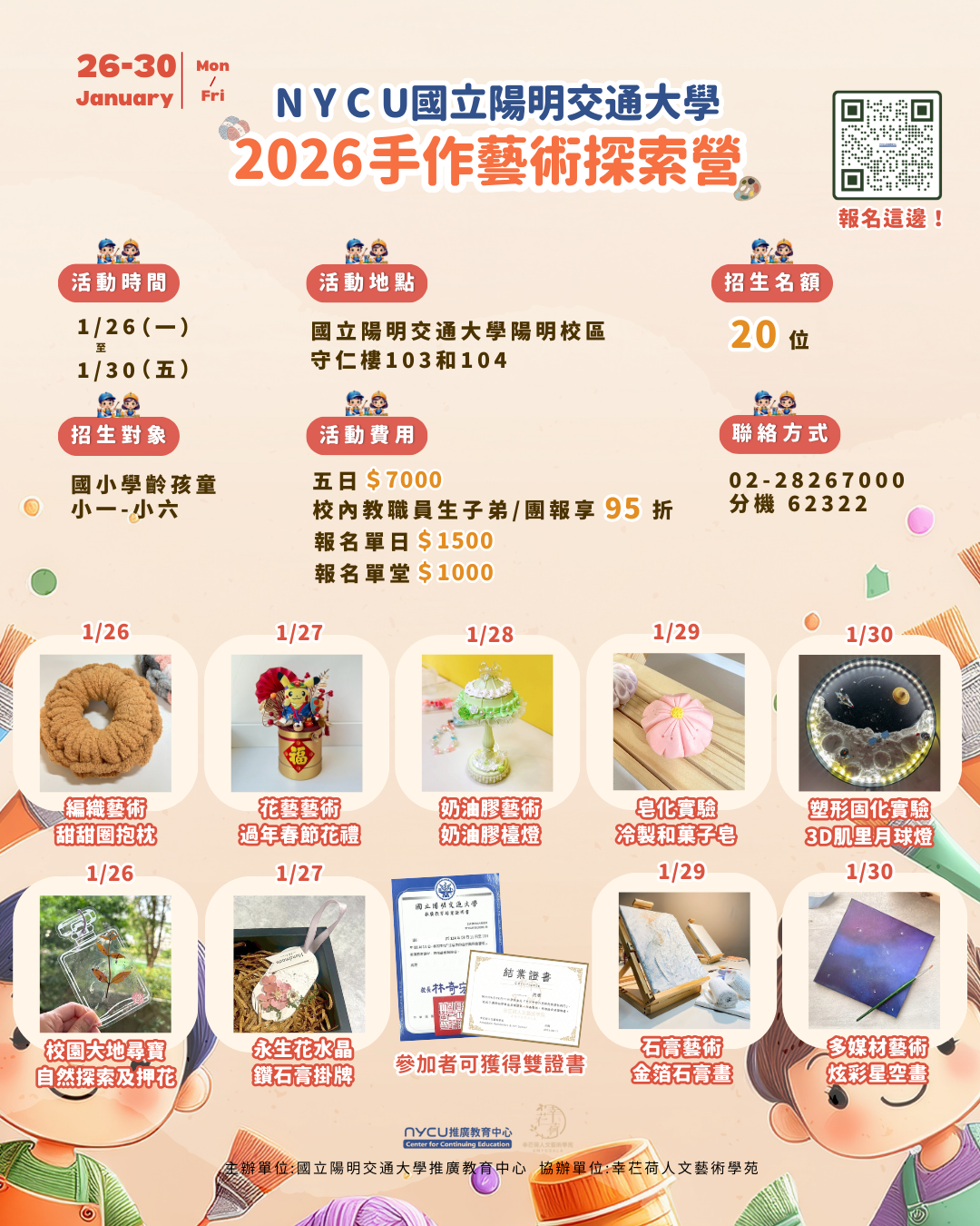 一、國立陽明交通大學推廣教育中心將於115年寒假辦理「2026手作藝術探索 營」5日兒童課程,引導孩童探索手作藝術創作的樂趣。