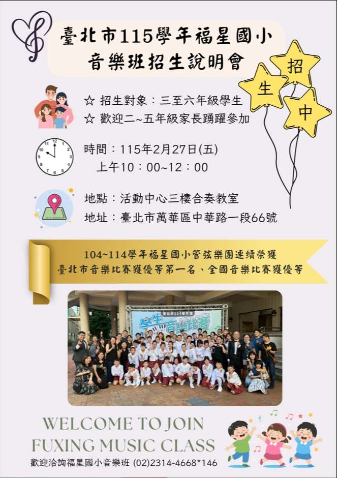 二、招生說明會資訊如下:時間:115年2月27日星期六上午10: 00。地點:福星國小學生活動中心三樓合奏教室。(臺北市 萬華區中華路一段66號,捷運北門1號出口站或西門町6號 出口)活動內容:簡介本校藝術才能音樂班及114學年度入 學考試相關內容,並介紹音樂班教學環境與教育特色,以 及國中升學管道之最新資訊。 三、若有任何問題,請致電本校音樂班公室02-23144668分機 146資料組。