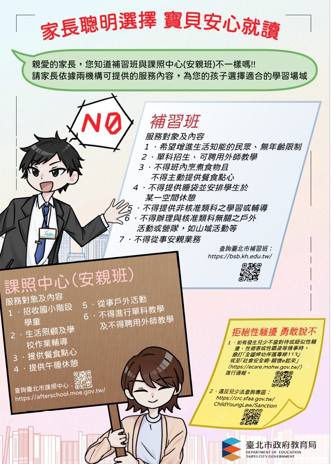 為維護學生學習安全,立案補習班聘僱教職員工係採事 先報備制,短期補習班查詢系統上經核備之教職員工名單 有定期與各不適任系統進行比對之機制,故家長可善用短期補習班資訊管理系統查詢補習班是否合格立案及授課教師是否經核備。倘補習班未經立案或師資未報備,可具名並檢具相關證明透過1999平台舉報,教育局將依所述時間地 點進行查處。