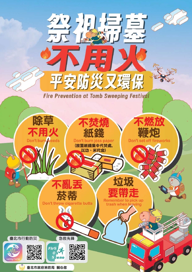 「除草不用火」、「不焚燒紙錢」、「不燃放鞭炮」、「不亂丟菸蒂」及「垃圾要帶走」