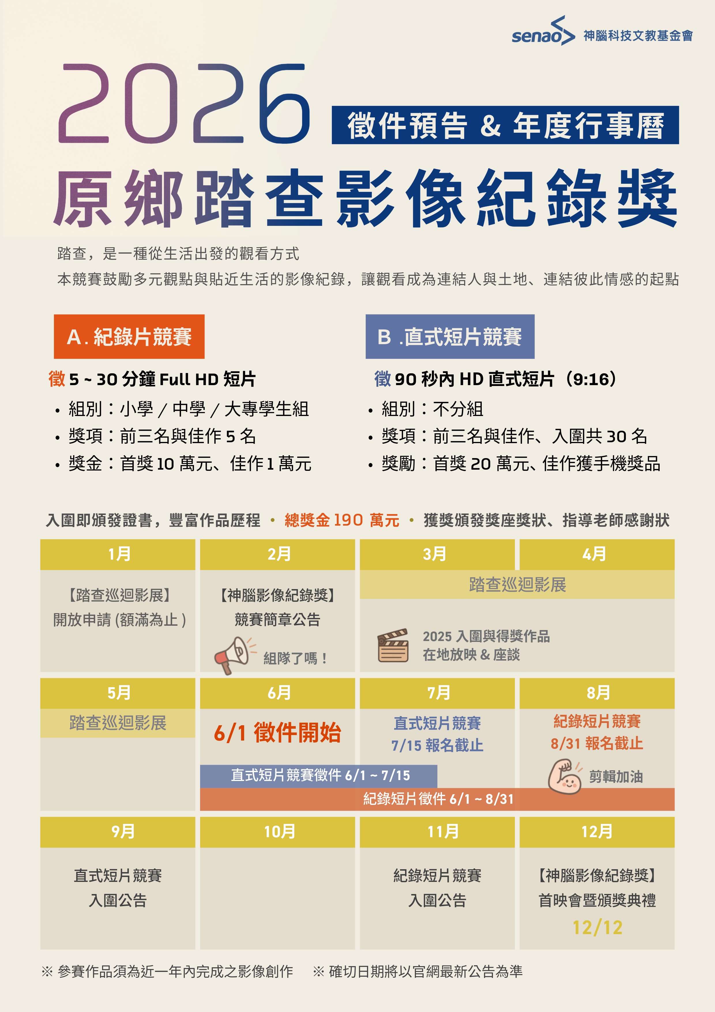 預計於 115 年 6 月 1 日起辦理「2026 神腦原鄉踏查影像紀錄獎」徵件。