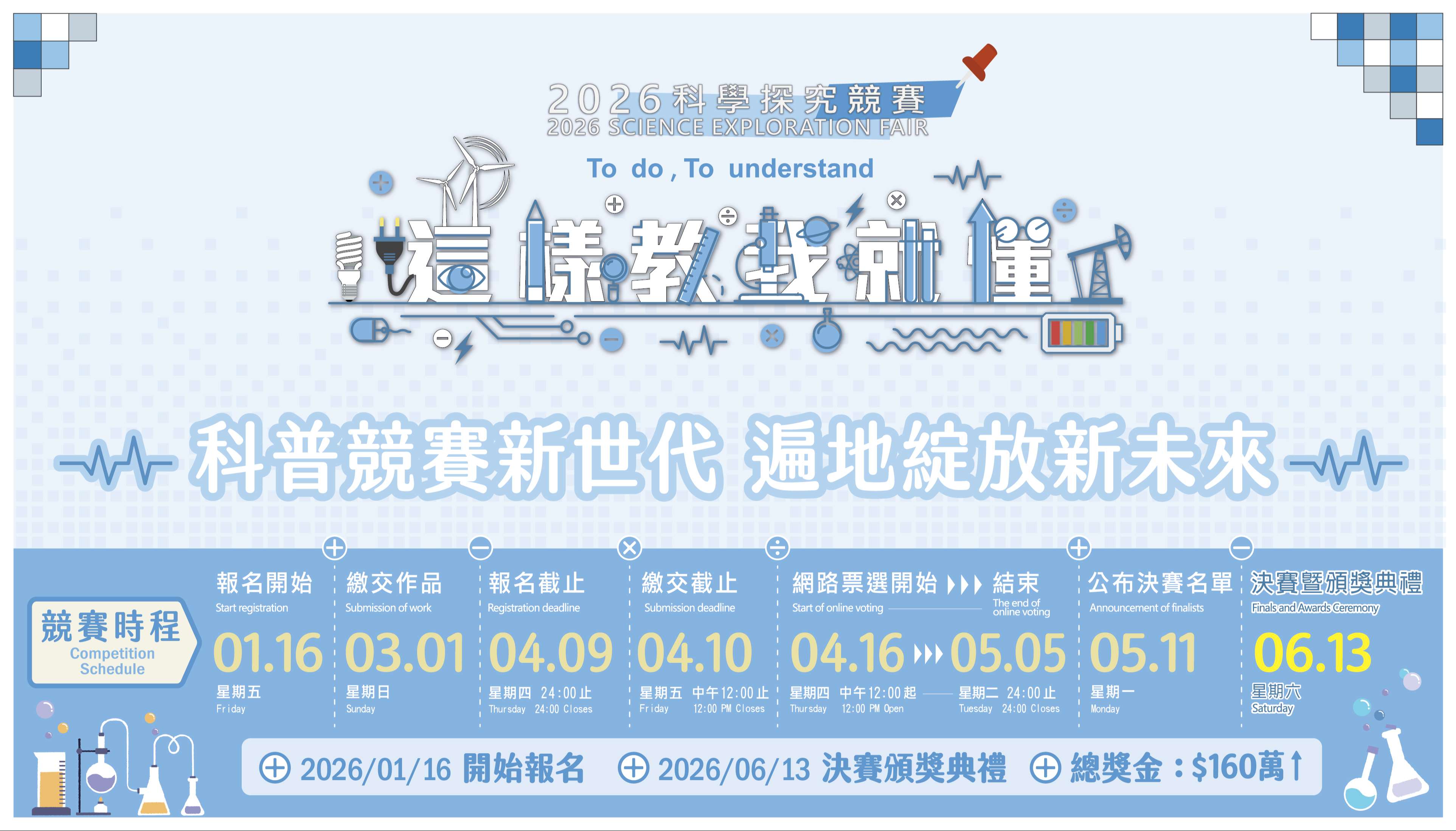 八、報名資訊、競賽方式與獎勵等相關資料請參閱附件或計畫網站(官網:https://sciexplore2026.colife.org.tw;粉絲專頁:https://www.facebook.com/ScitechvistaFair)。相關事宜如有疑義,請逕洽本競賽承辦人陳小姐,(電話:06-5050940分機661、電子信箱:sciexplore.tw@gmail.com)。
