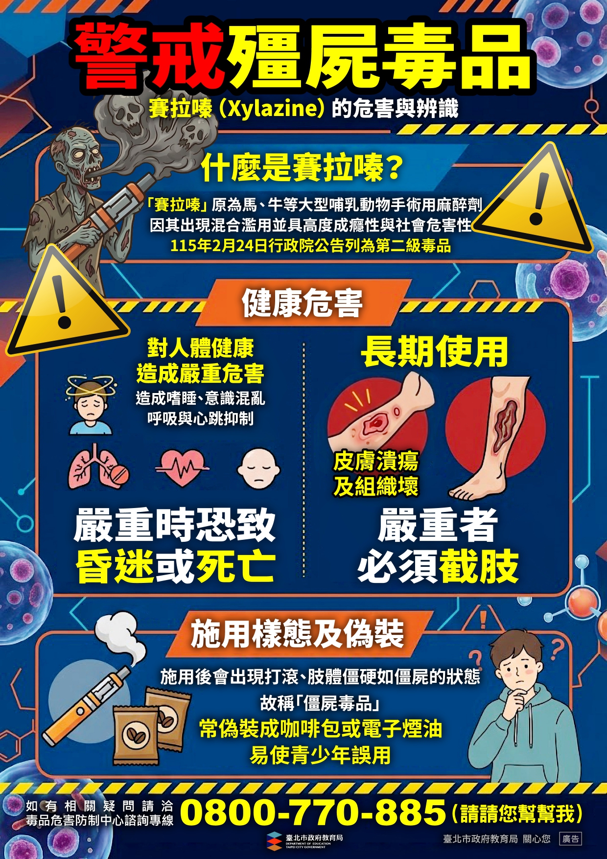 二、「賽拉嗪(Xylazine)」原為獸醫使用之麻醉藥物,近年 遭濫用並常與其他毒品混合使用,施用後會出現打滾、肢體僵硬如僵屍的狀態, 故稱「僵屍毒品」。