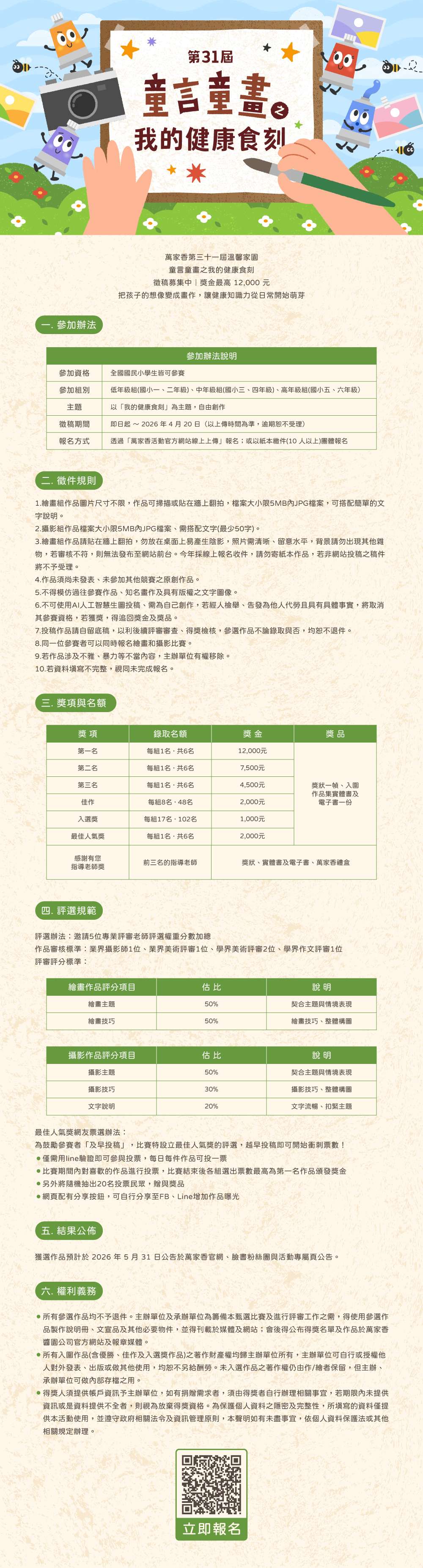 目前的環境,充斥著高糖高鹽的加工零食和各式含糖過量的飲料;而孩子們挑食偏食、經常外食的飲食習慣,有可能會導致蔬果與優質蛋白不足。故今年活動的徵件主題,以「孩童的健康知識力」為主題,回應當代家庭和學校對健康飲食教育的重視;萬家香期望透過孩子的創作視角,引導其認識健康飲食的重要性;培養下一代的健康知識力!