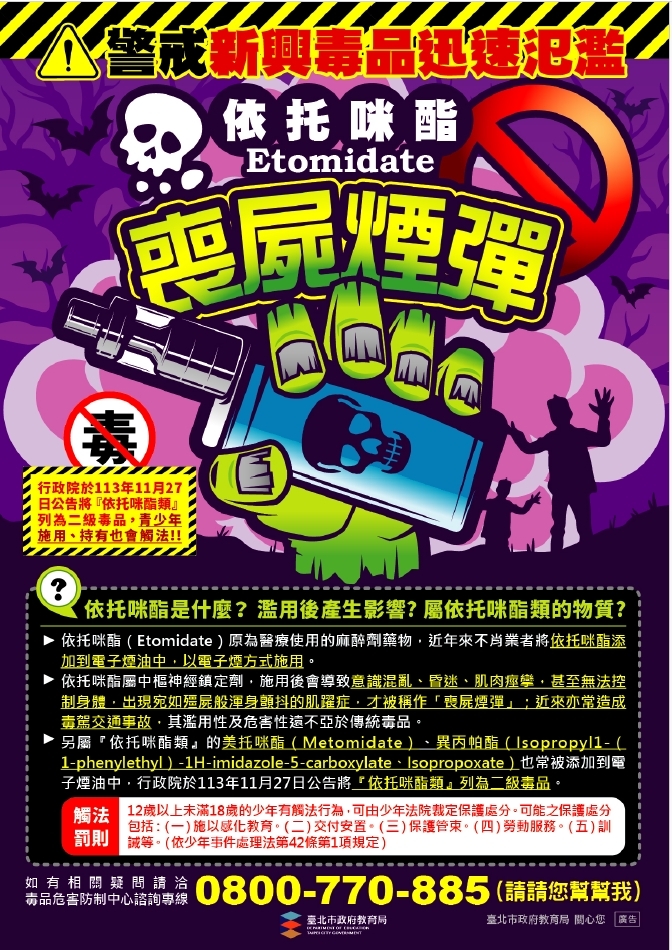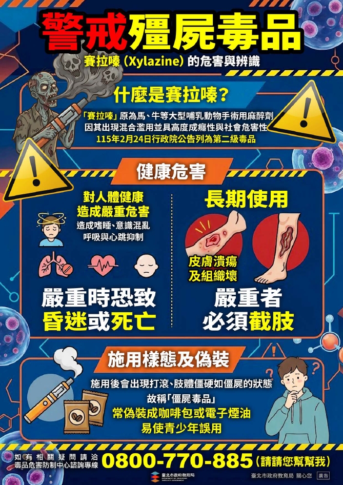 「賽拉嗪(Xylazine)」原為獸醫使用之麻醉藥物,近年 遭濫用並常與其他毒品混合使用,施用後會出現打滾、肢 體僵硬如僵屍的狀態,故稱「僵屍毒品」;「吩坦尼 (INN:fentanyl)或芬太尼」,是一種強效的人工合成類 鴉片藥物,施用後會出現類似「喪屍」般彎腰的狀態。